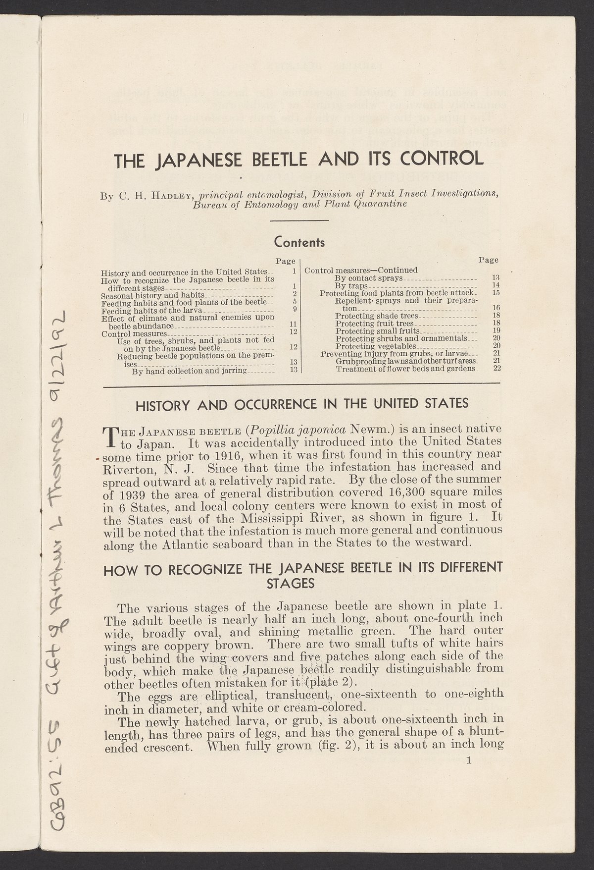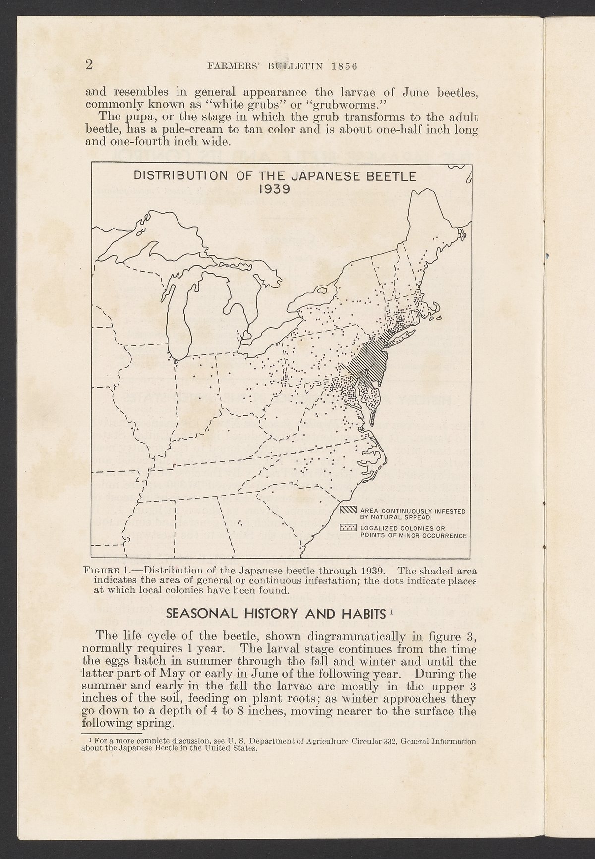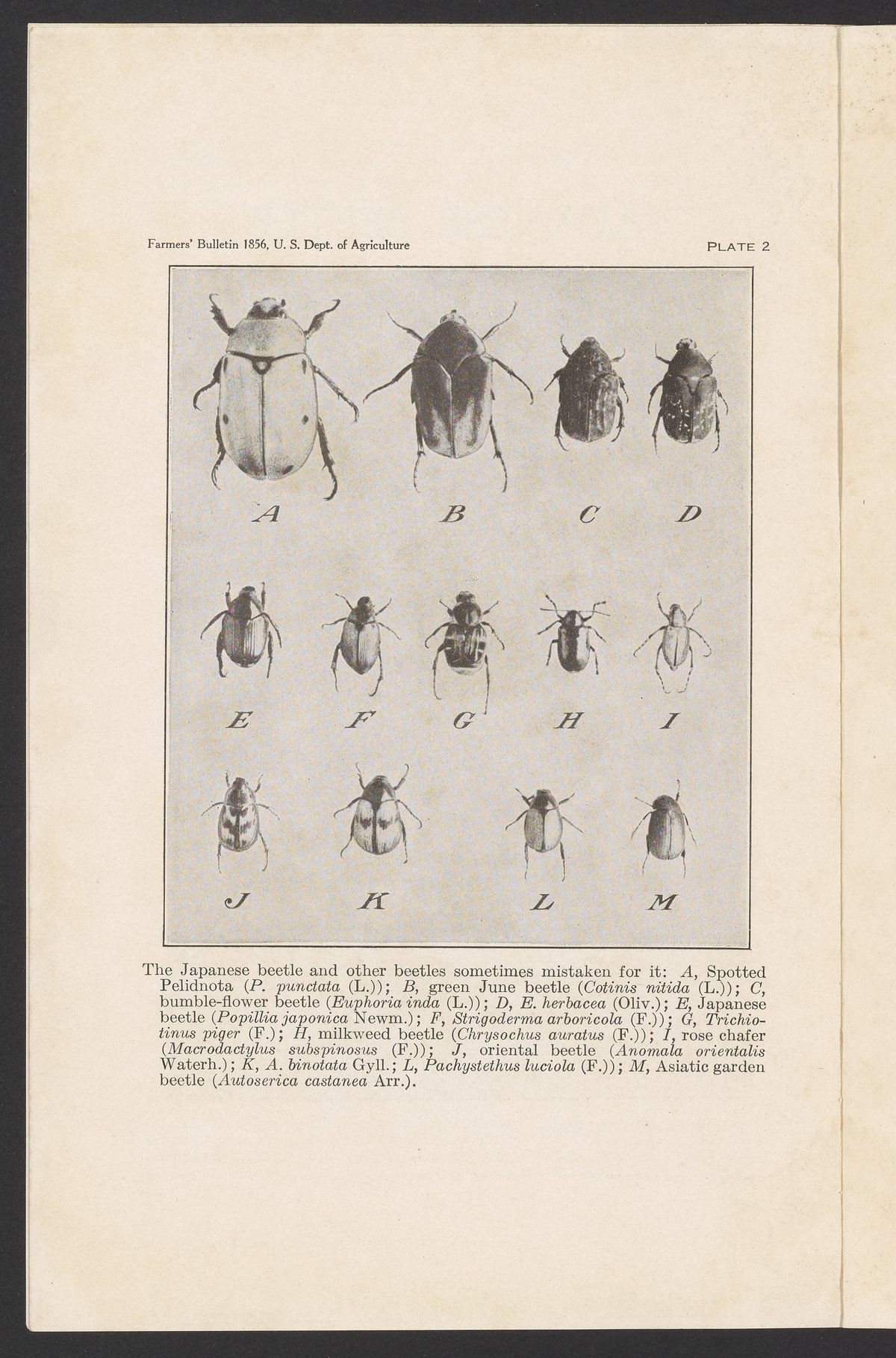 Small JPG1200 x 1843px — 544 KBFull-sized JPG2509 x 3853px — 2.3 MBOriginal fileTIFF — 2509 x 3853px — 27.7 MBJournal number 1856 in the Farmers' Bulletin series published by the United States Department of Agriculture. The article describes the Japanese beetle, a pest brought to the United States from Japan, including its seasonal history, harmful habits, and the methods found useful in destroying the insect or preventing injury to crops and plants. The work includes both black and white and color illustrations. This issue was contributed to by the United States Bureau of Entomology and Plant Quarantine.
