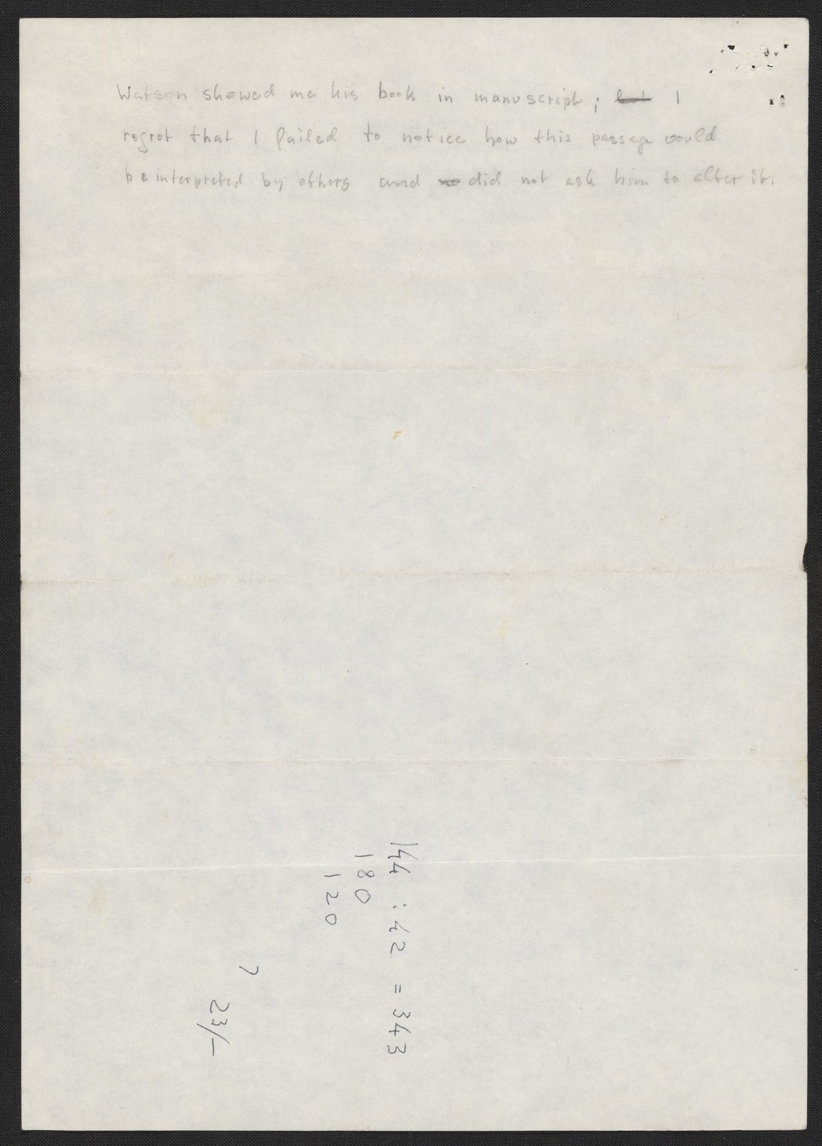 Small JPG1200 x 1701px — 351 KBLarge JPG2880 x 4081px — 1.8 MBFull-sized JPG5183 x 7345px — 5.5 MBOriginal fileTIFF — 5183 x 7345px — 109 MBDrafts of a letter to the editor of Scientific American, written by Max Perutz (1914-2002), regarding Andre Lwoff's (1902-1994) review of James D. Watson's (1928-2025) book The Double Helix.