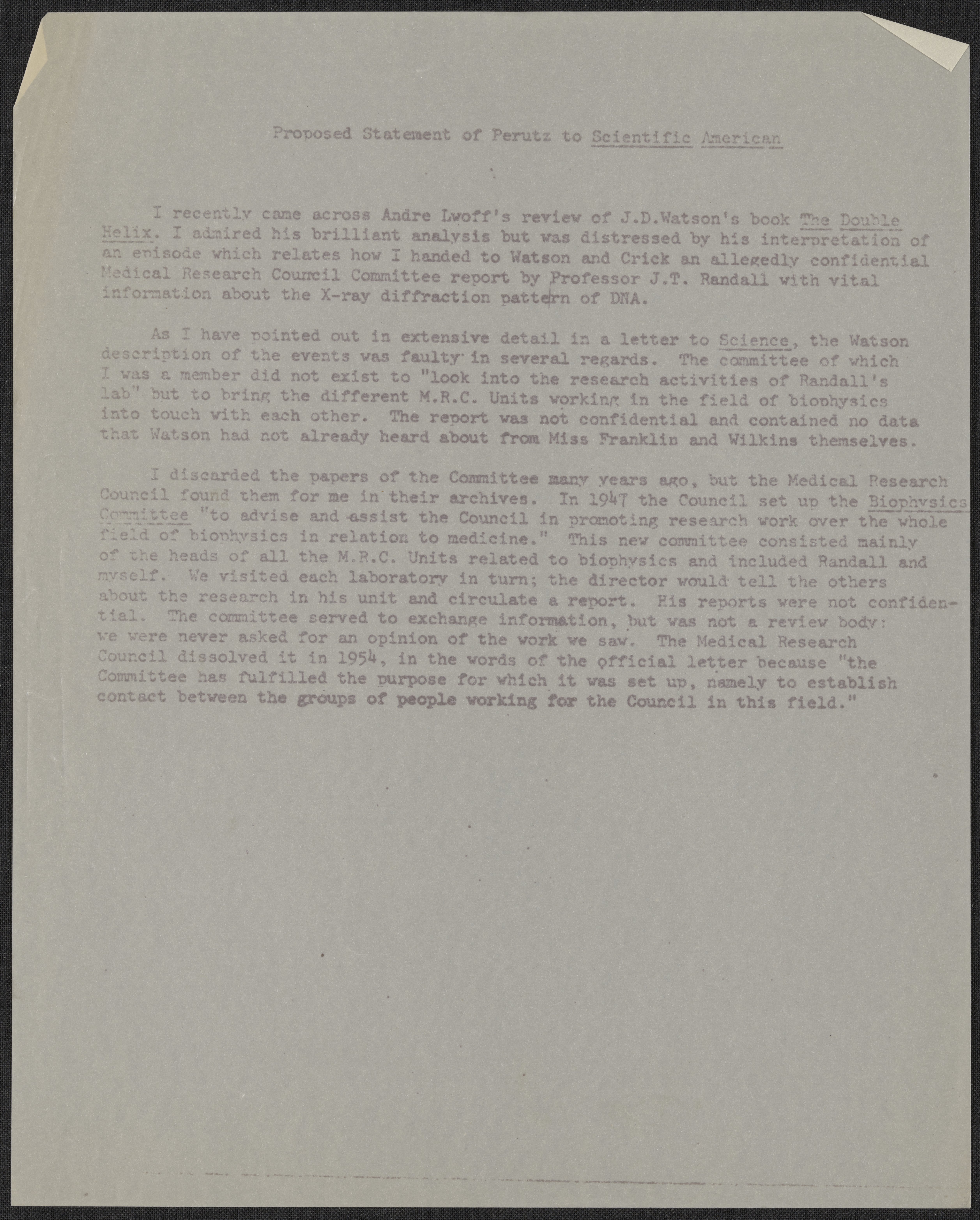 Drafts of a letter to the editor of the Scientific American, written by Max Perutz