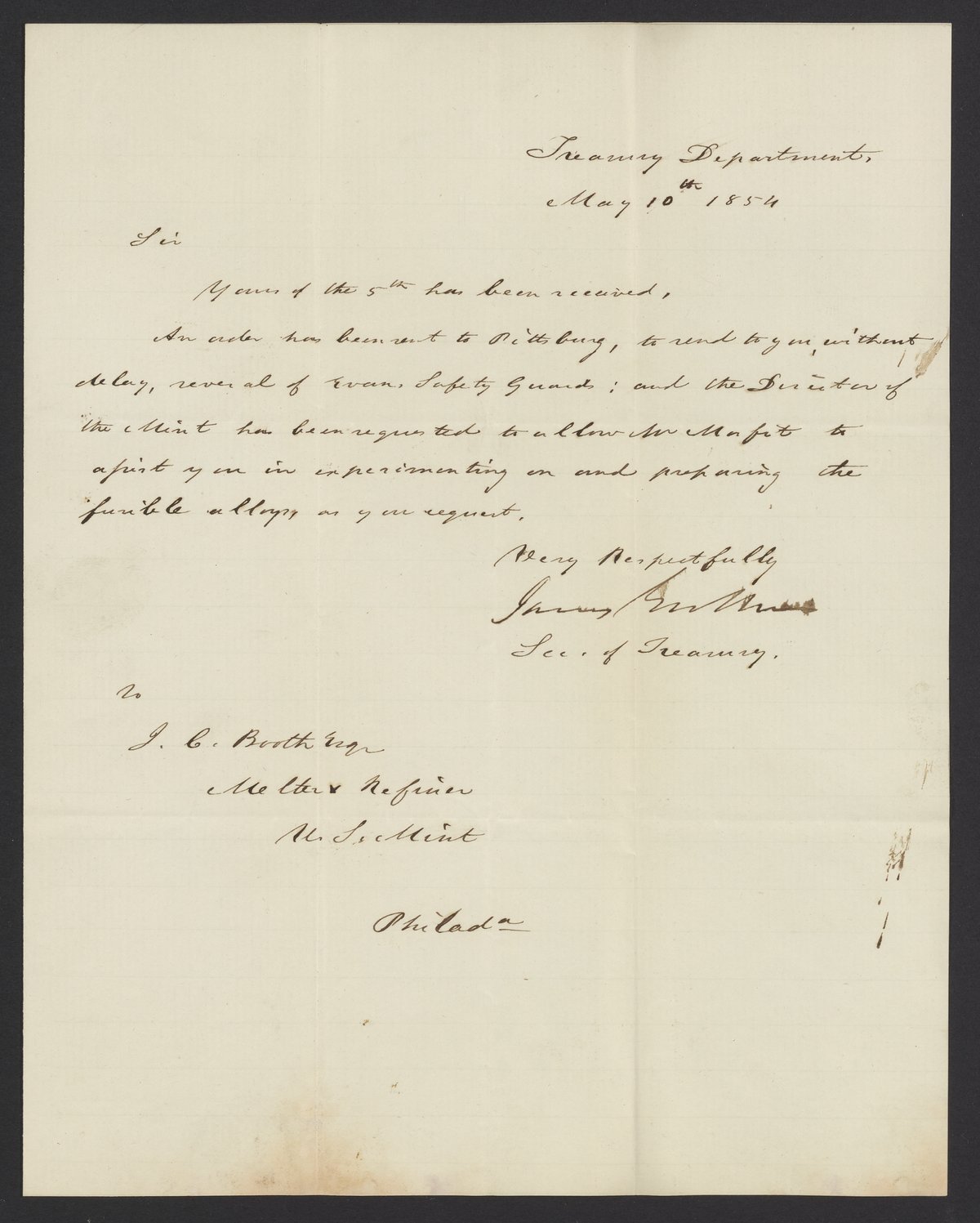 Letter from James B. Guthrie to James Curtis Booth, May 10, 1854