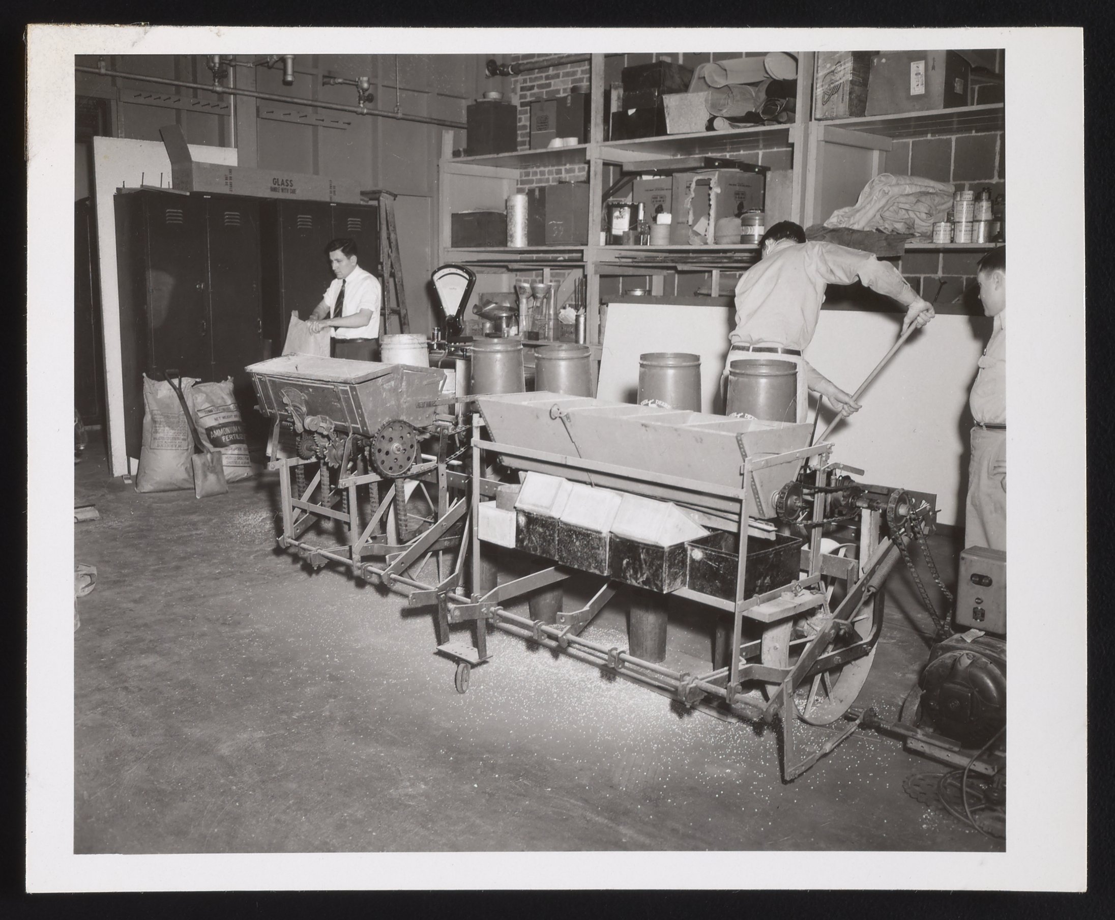 General view of an unidentified room at the U.S. Department of Agriculture's Agricultural Engineering Laboratory showing a drillability apparatus with fertilizer hoppers, a starwheel, and rotating plate mechanism.