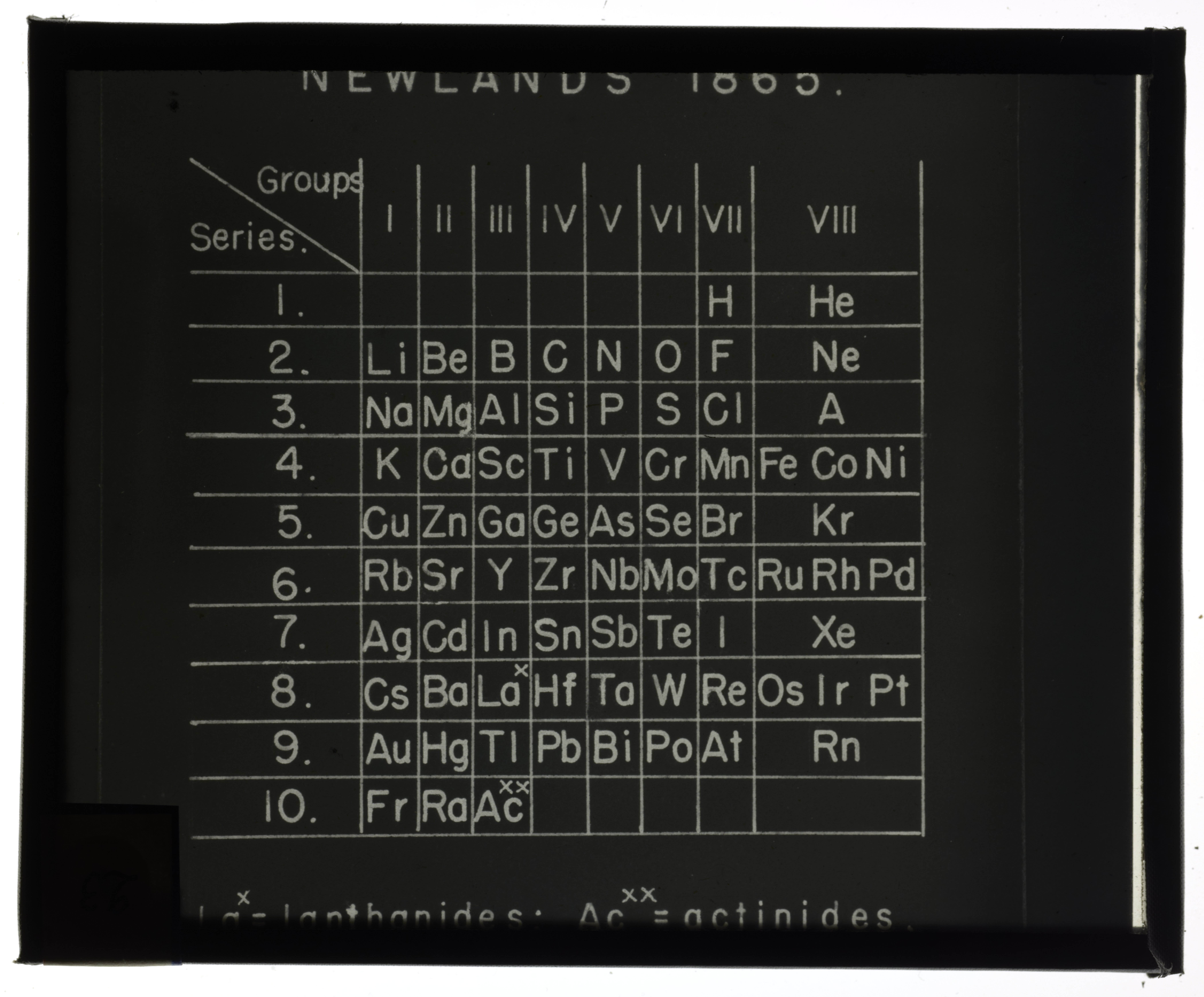 Newlands, John A. R., and Edward G. Mazurs. “Series Table Based on Law of Octaves.” Glass (material), circa 1865–1957. Edward G. Mazurs Collection of Periodic Systems Images, Box 1. Science History Institute. Philadelphia. https://digital.sciencehistory.org/works/xg94hq04d.
