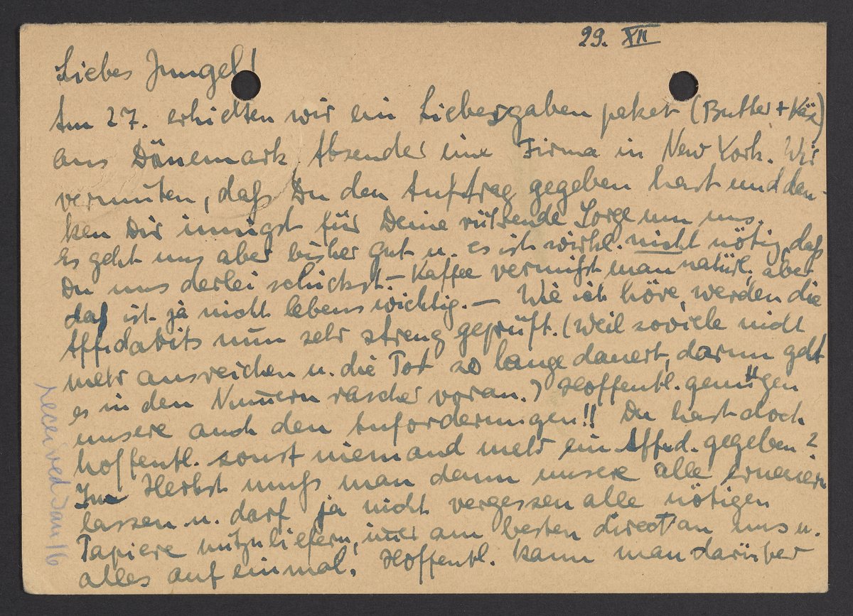 Postcard from Marianne Homburger to Max Bredig, December 29, 1939
