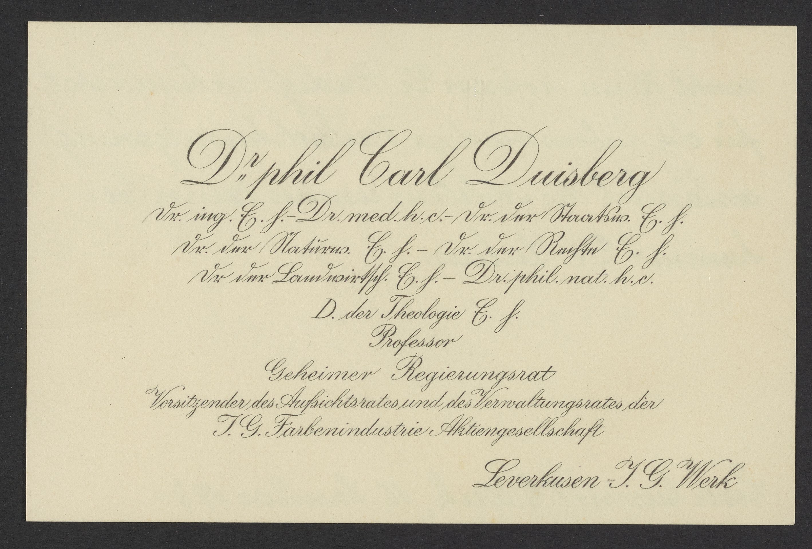 Duisberg, Carl. “Carl Duisberg's Personal Calling Card,” 1931. Papers of Georg and Max Bredig, Box 3, Folder 18. Science History Institute. Philadelphia. https://digital.sciencehistory.org/works/xj2fbjz.