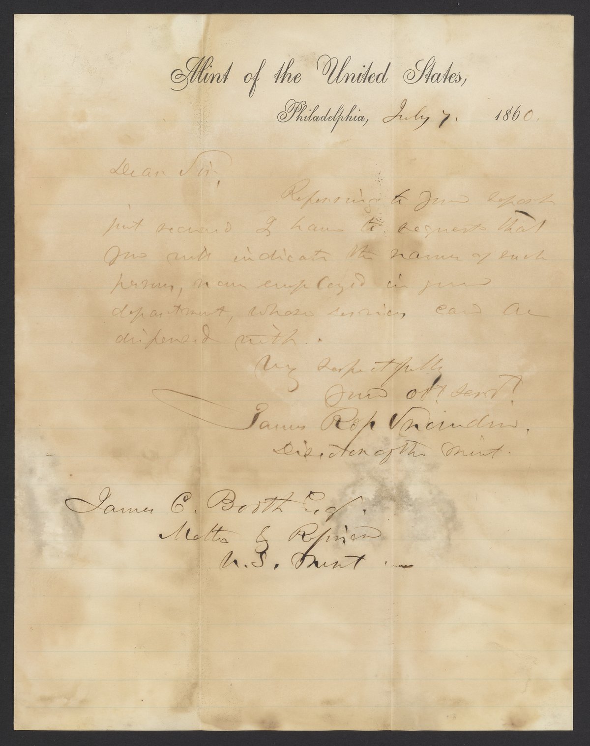 Small JPG1200 x 1518px — 193 KBLarge JPG2880 x 3643px — 1.1 MBFull-sized JPG3306 x 4182px — 1.4 MBOriginal fileTIFF — 3306 x 4182px — 39.6 MBJames Ross Snowden (1809-1878), Director of the United States Mint, asks James Curtis Booth (1810-1888) the names of men who can be dispensed with at the Mint.