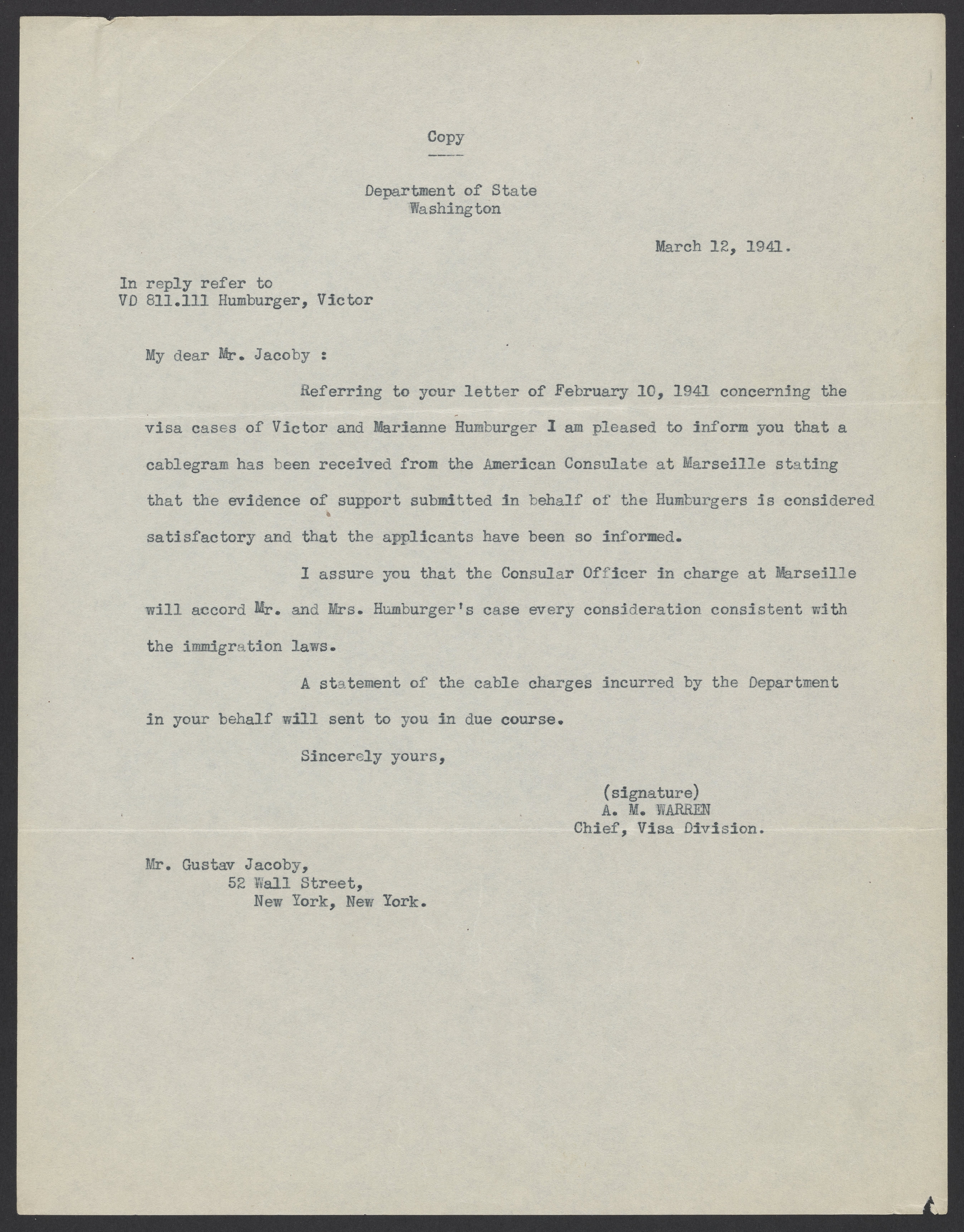 Letter from A. M. Warren to Gustav Jacoby, March 12, 1941