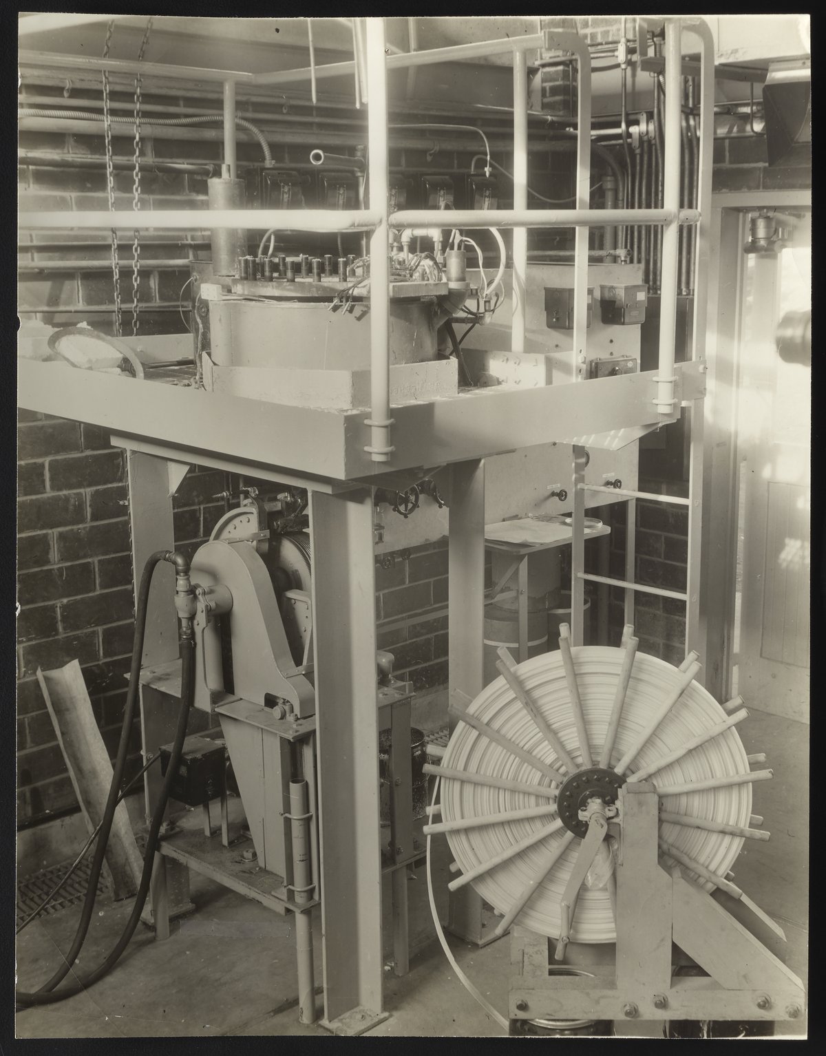 General view of a 50-pound autoclave and polymer casting equipment used during the early stages of nylon production and research at the DuPont Experimental Station in Wilmington, Delaware. During production, a partially-evaporated nylon salt solution was fed into the autoclave and heated to 275 degrees centigrade under a pressure of 275 pounds per square inch in order to precipitate polymerization. Once polymerization occurred, additional water was bled off and the pressure was slowly reduced to atmospheric levels before the polymer was extruded. As visible on the right-hand side of the photograph, the hot polymer ribbon was extruded and wound onto a reel before being broken into nylon chips for spinning.