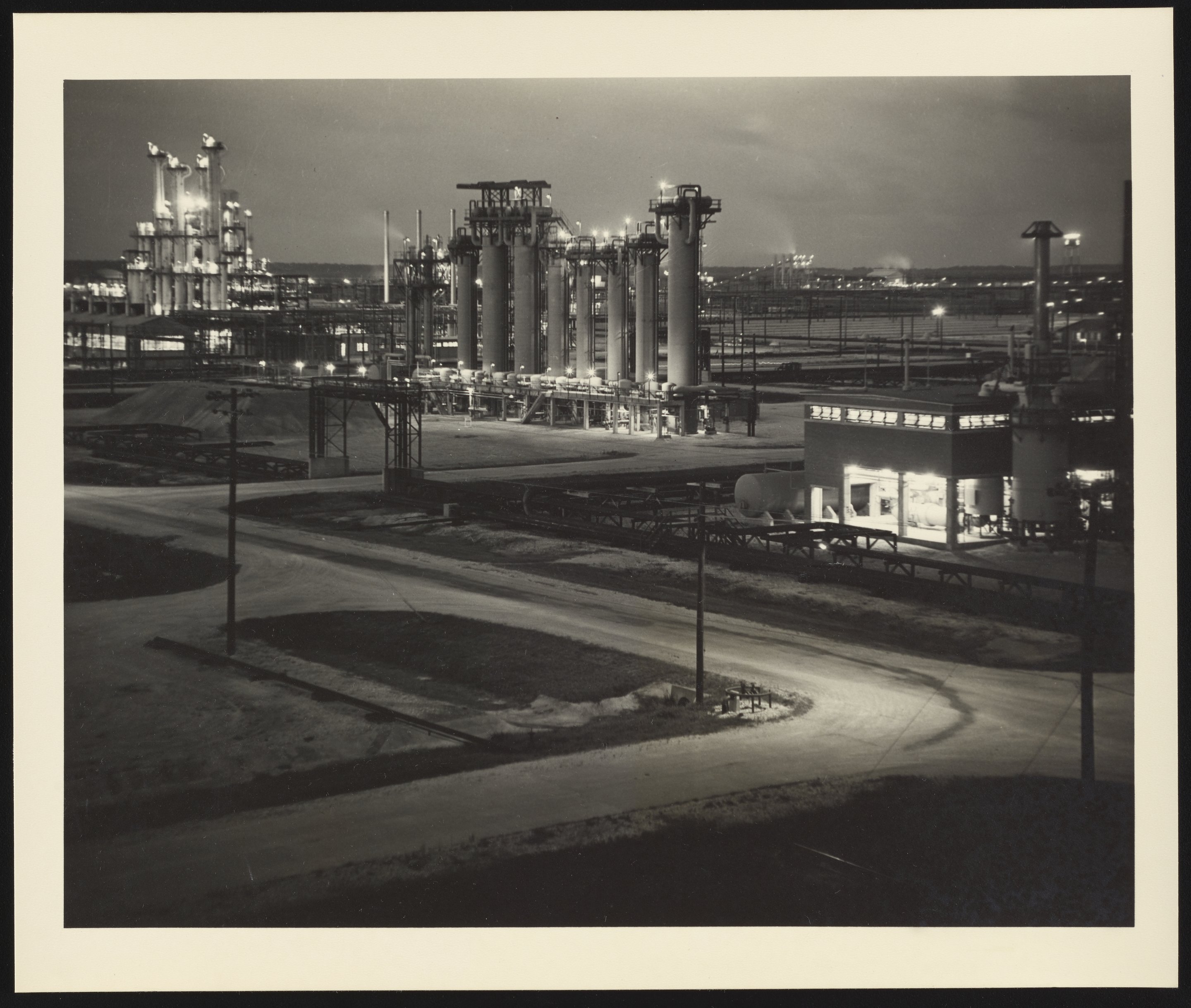 General exterior view, taken at night, of the Dow Chemical Company Texas Division plant located in Freeport, Texas. A range of products and processes were researched, developed, and produced at the plant, including chlorination, phenol, and magnesium.