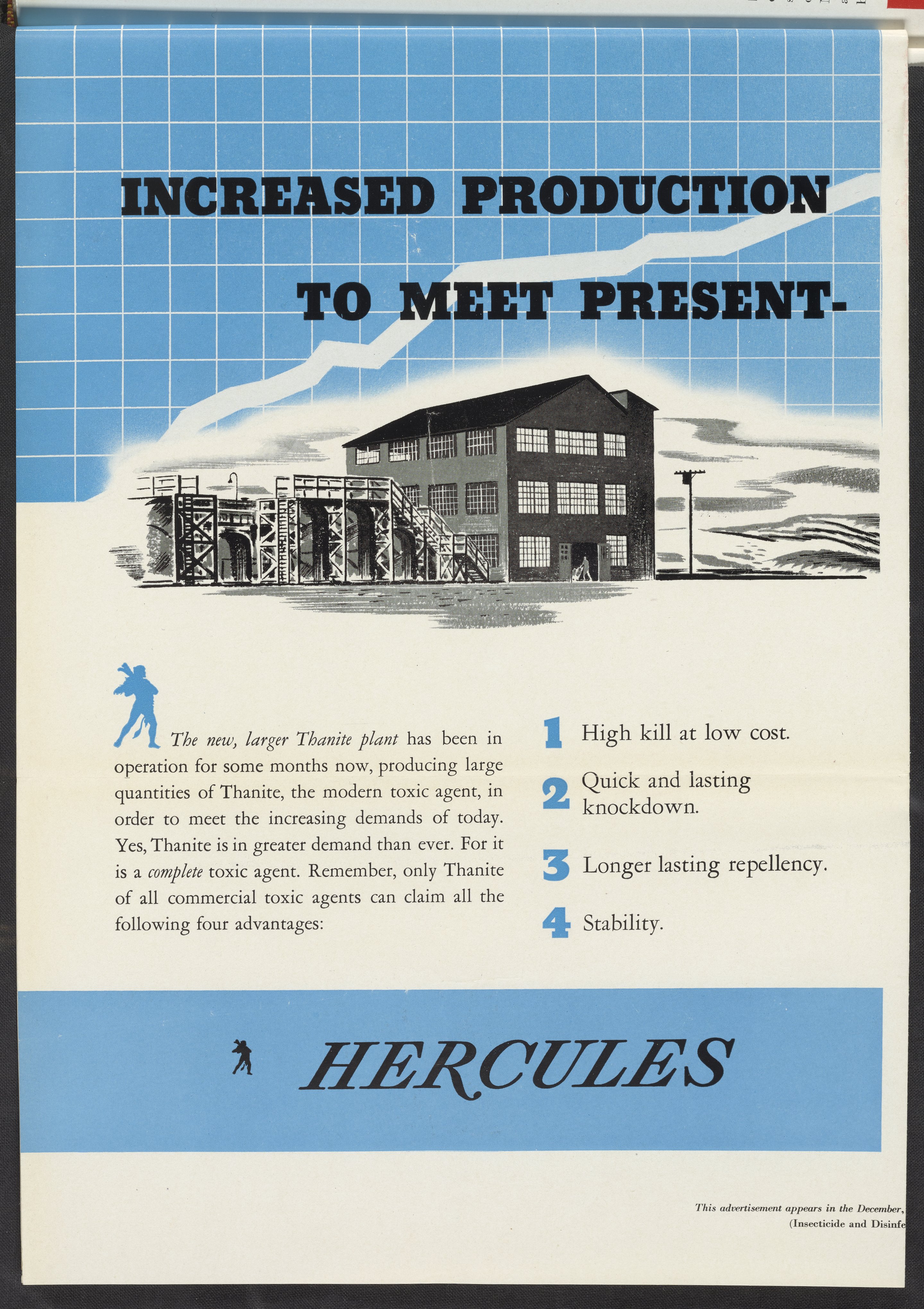 Hercules Incorporated. “Increased Production of Thanite to Meet Present-Day Demands!” 1944 Hercules Advertisements, 1944. Records of Hercules Incorporated, Volume 1944. Science History Institute. Philadelphia. https://digital.sciencehistory.org/works/xk81jm17q.