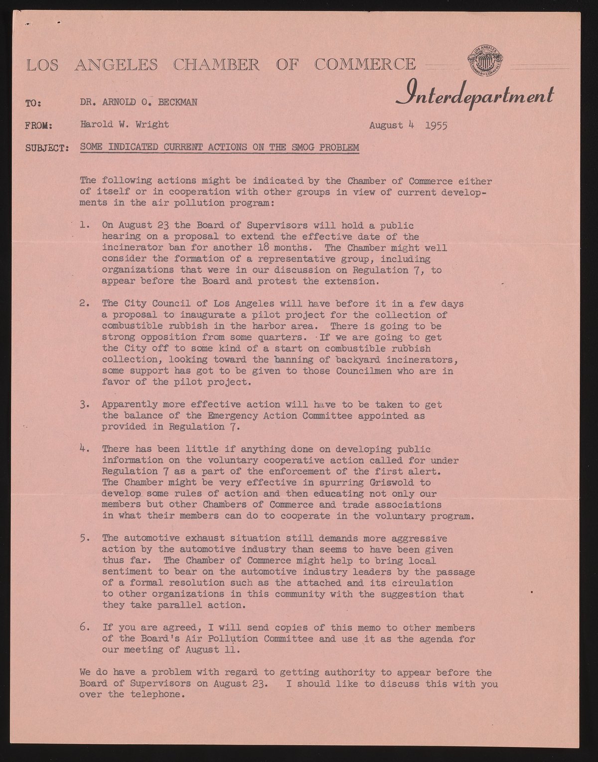 Memo from Harold W. Wright to Arnold O. Beckman