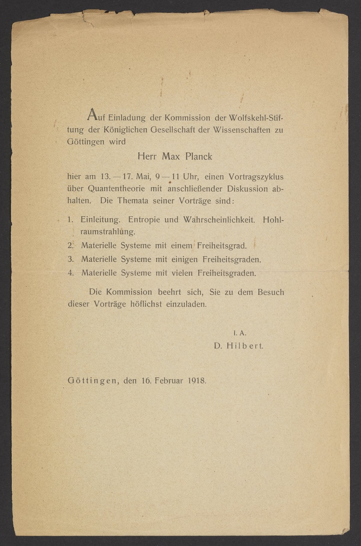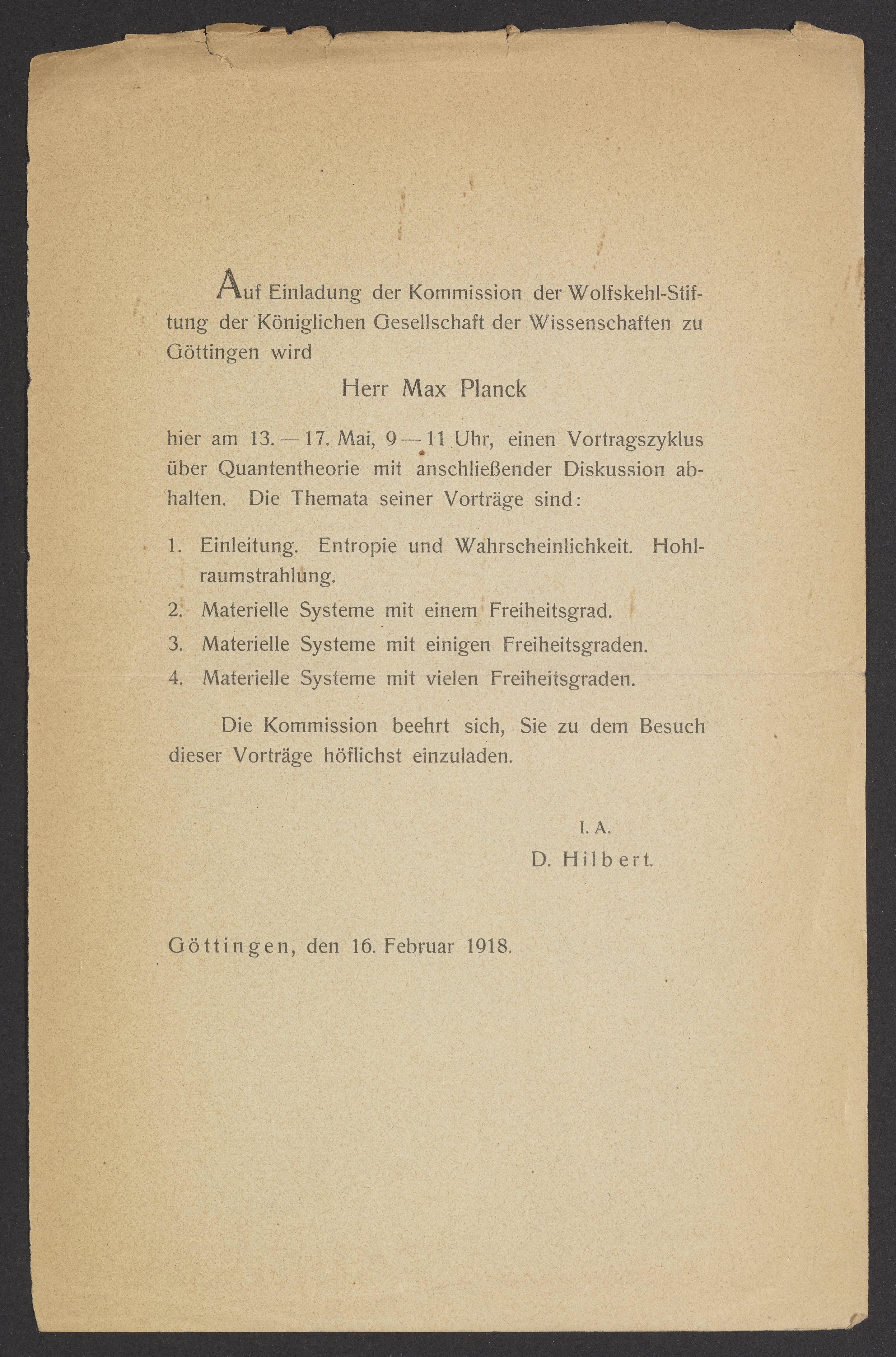 Invitation to lectures by Max Planck