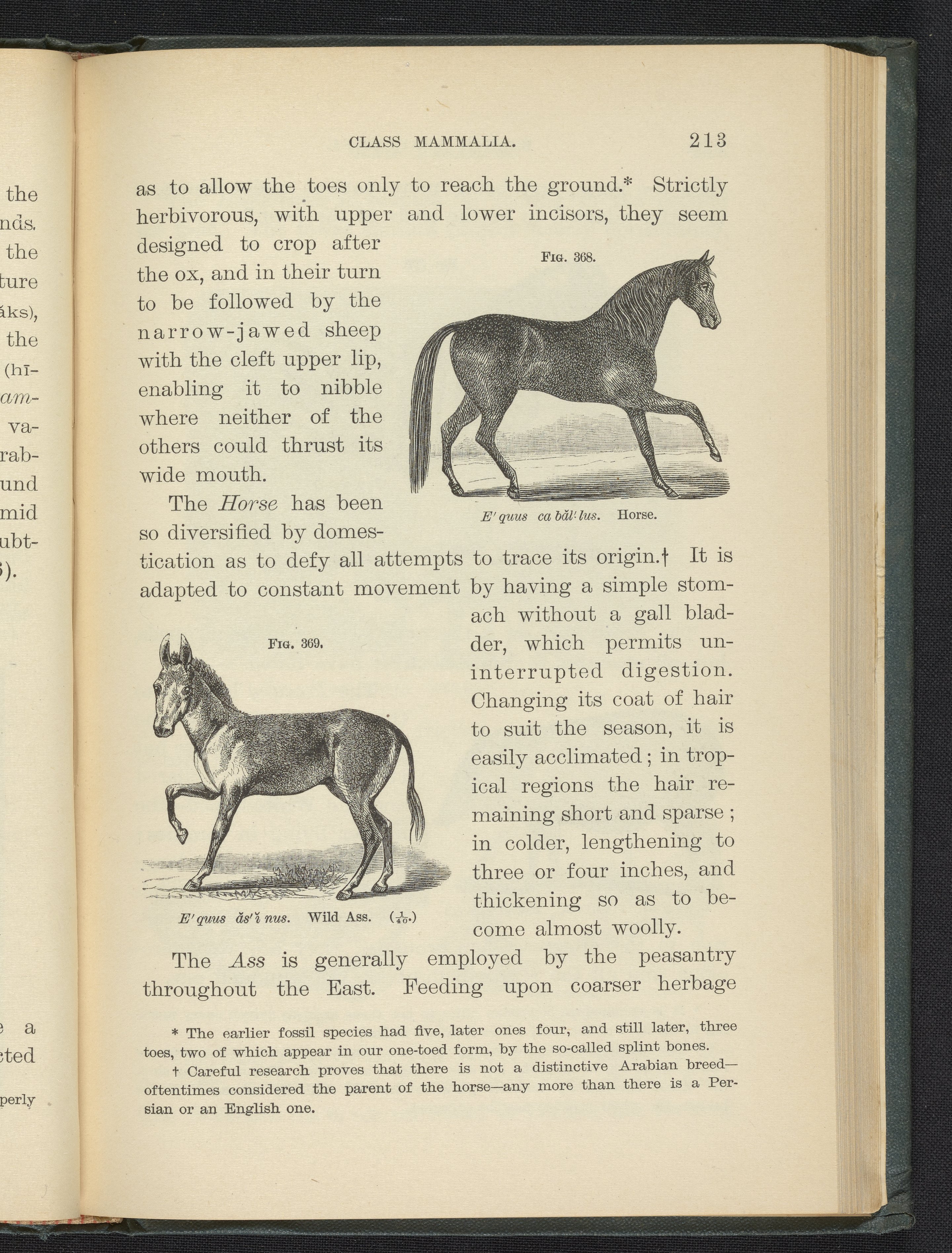 Figures 368 and 369 of the 1887 volume Popular Zoology. Figure 368 depicts a horse. Figure 369 depicts a wild ass, also known as a wild donkey.