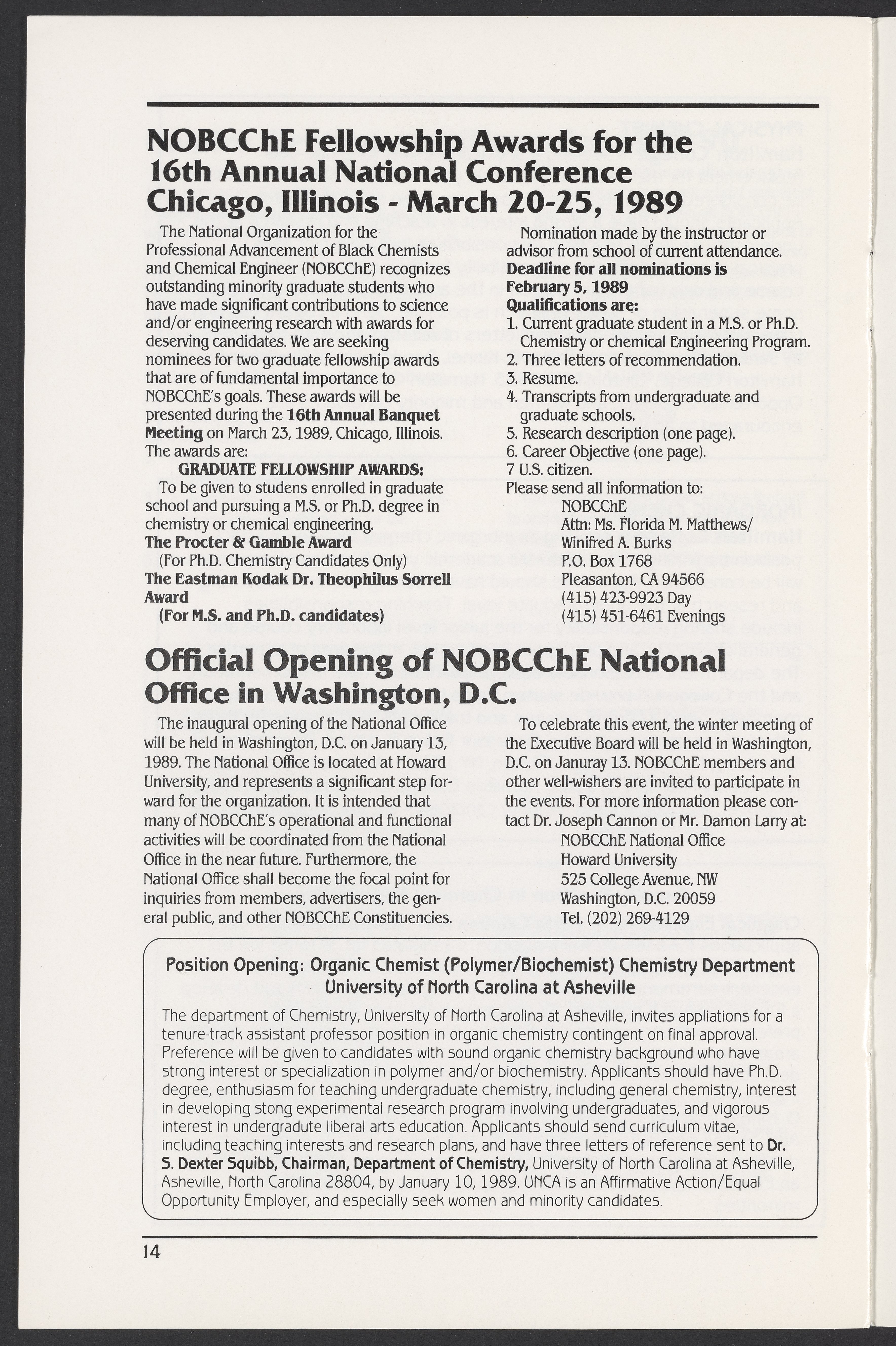 “NOBCChE News, Volume 10, Number 1.” Rochester, New York: National Organization for Black Chemists and Chemical Engineers, December 1988. William A. Lester, Jr. Papers, Box 46, Folder 23. Science History Institute. Philadelphia. https://digital.sciencehistory.org/works/xoa19mw.