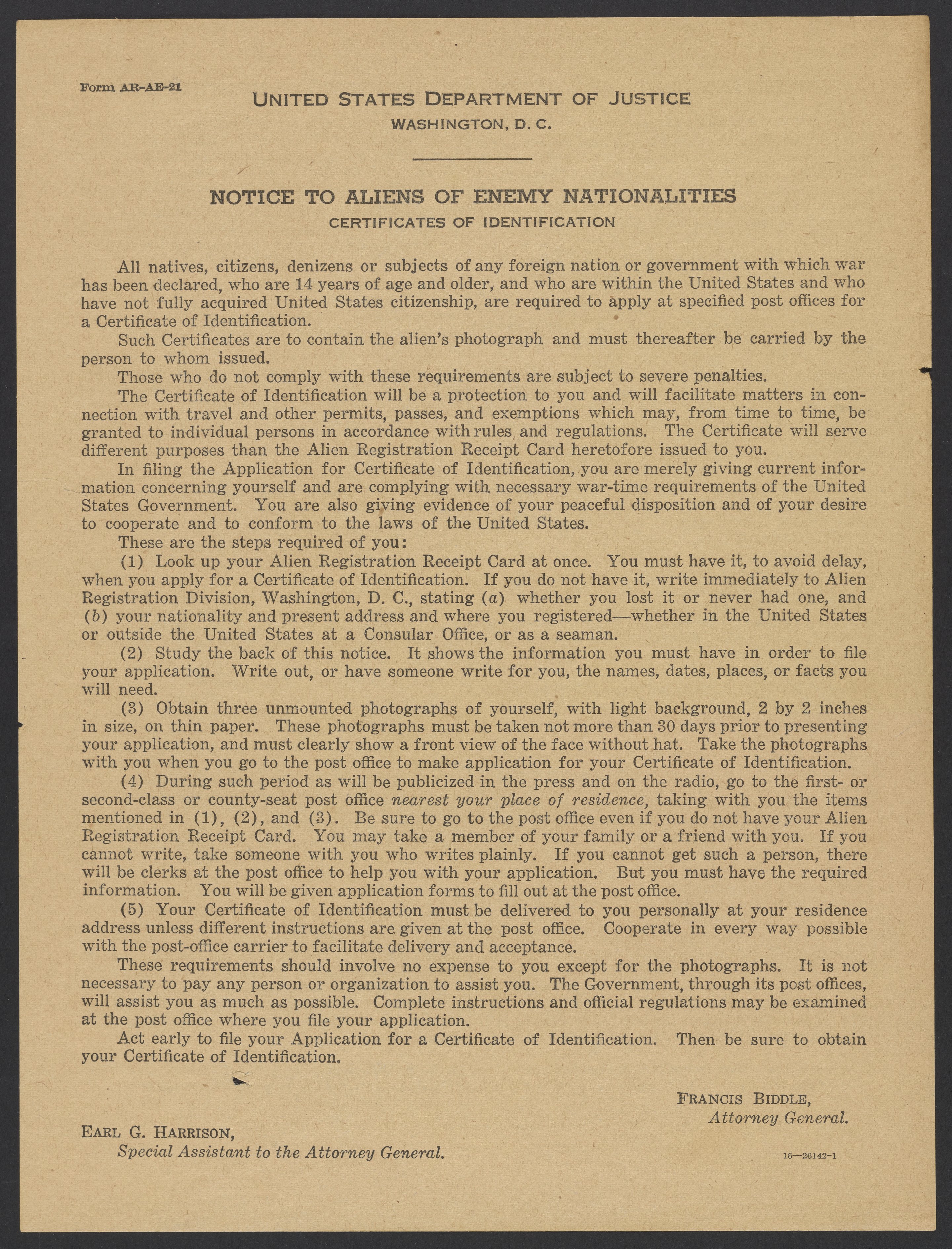 United States Department of Justice Notice to Aliens of Enemy Nationalities