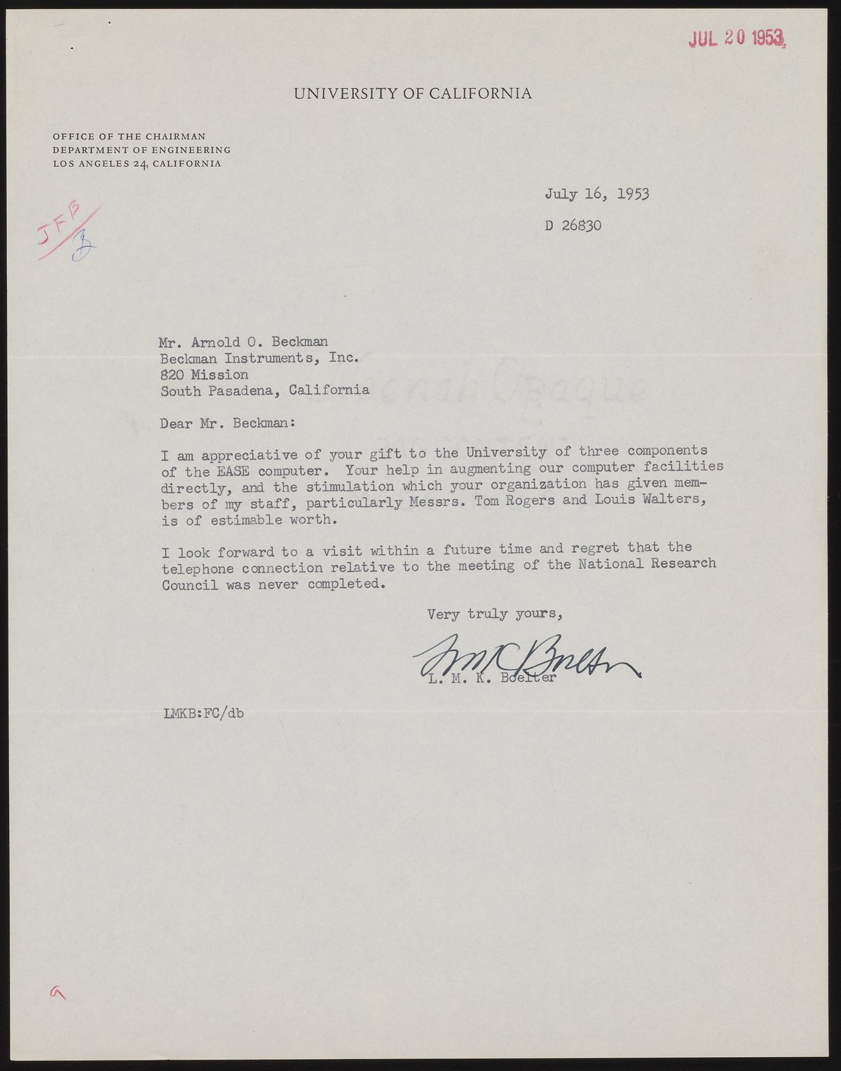 Boelter, L. M. K. (Llewellyn Michael Kraus). “Letter from L. M. K. Boelter to Arnold O. Beckman,” July 16, 1953. Beckman Historical Collection, Box 13, Folder 17. Science History Institute. Philadelphia. https://digital.sciencehistory.org/works/xp68kg21m.