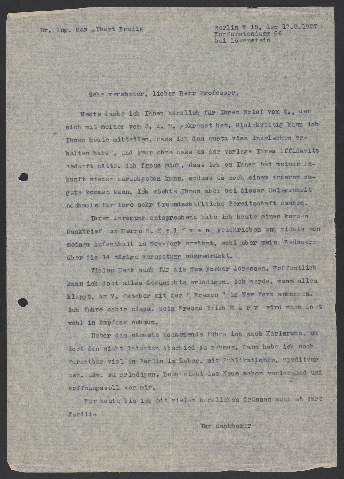 Max Albert Bredig (1902-1977) informs Kasimir Fajans (1887-1975) that he received a visa for the United States and will travel to New York next week. He plans say travel to Karlsruhe, Germany to say farewell to his family.