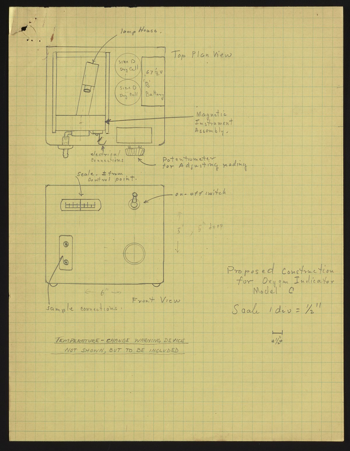 “Proposed Construction for Oxygen Indicator Model C,” circa 1944. Beckman Historical Collection, Box 19, Folder 8. Science History Institute. Philadelphia. https://digital.sciencehistory.org/works/xs55mc445.
