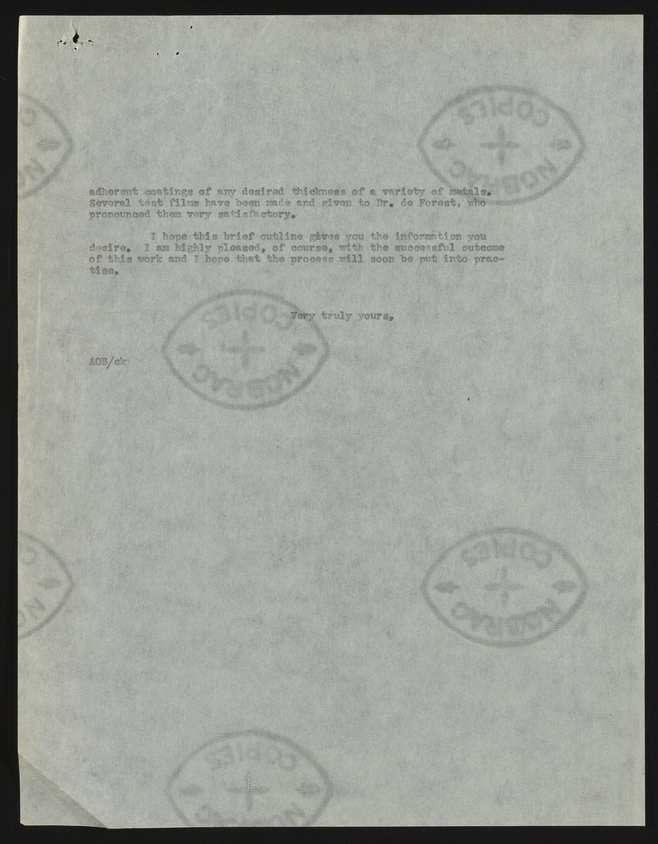 Small JPG1200 x 1528px — 352 KBFull-sized JPG2803 x 3568px — 1.8 MBOriginal fileTIFF — 2803 x 3568px — 28.7 MBArnold O. Beckman provides an overview of the vacuum film-coating process developed for Lee de Forest. The process successfully coated film with magnesium, lead, bismuth, aluminum, and silver. The letter is apparently addressed to de Forest's funding source.
