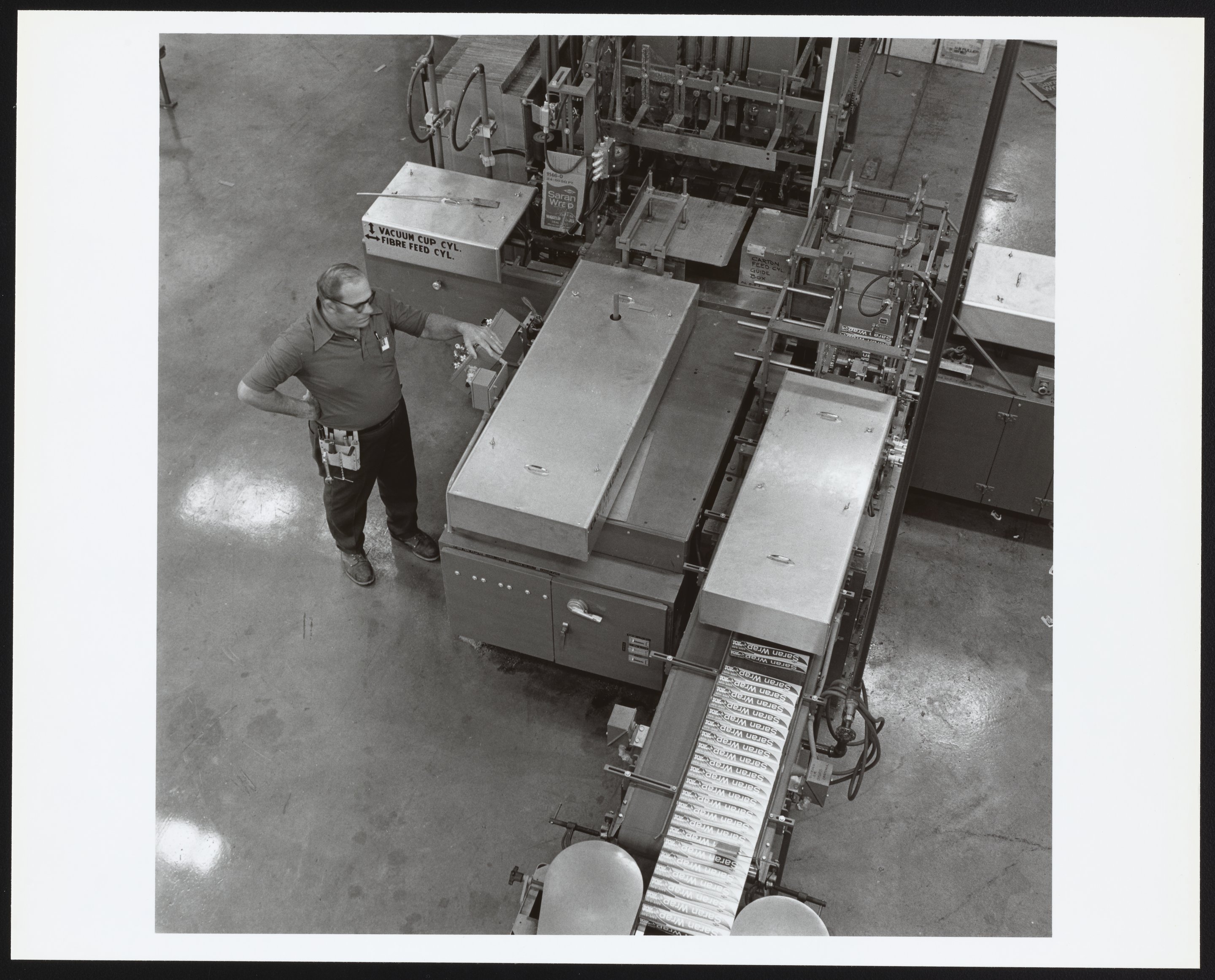 Elevated view of a conveyor belt transporting boxes of Saran Wrap at a Dow Chemical Company manufacturing facility in Midland, Michigan. Initially developed for the U.S. Army to wrap arms and equipment for transport during World War II, saran plastic was subsequently developed and marketed as Saran Wrap for household use. The employee visible in the photograph is unidentified.
