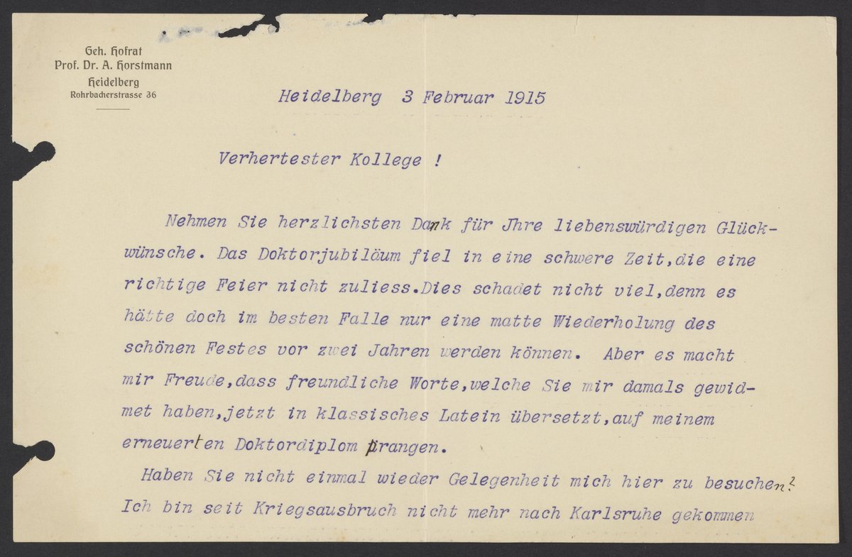 Horstmann, August Friedrich. “Letter from August Friedrich Horstmann to Georg Bredig,” February 3, 1915. Papers of Georg and Max Bredig, Box 2, Folder 4. Science History Institute. Philadelphia. https://digital.sciencehistory.org/works/xviju54.