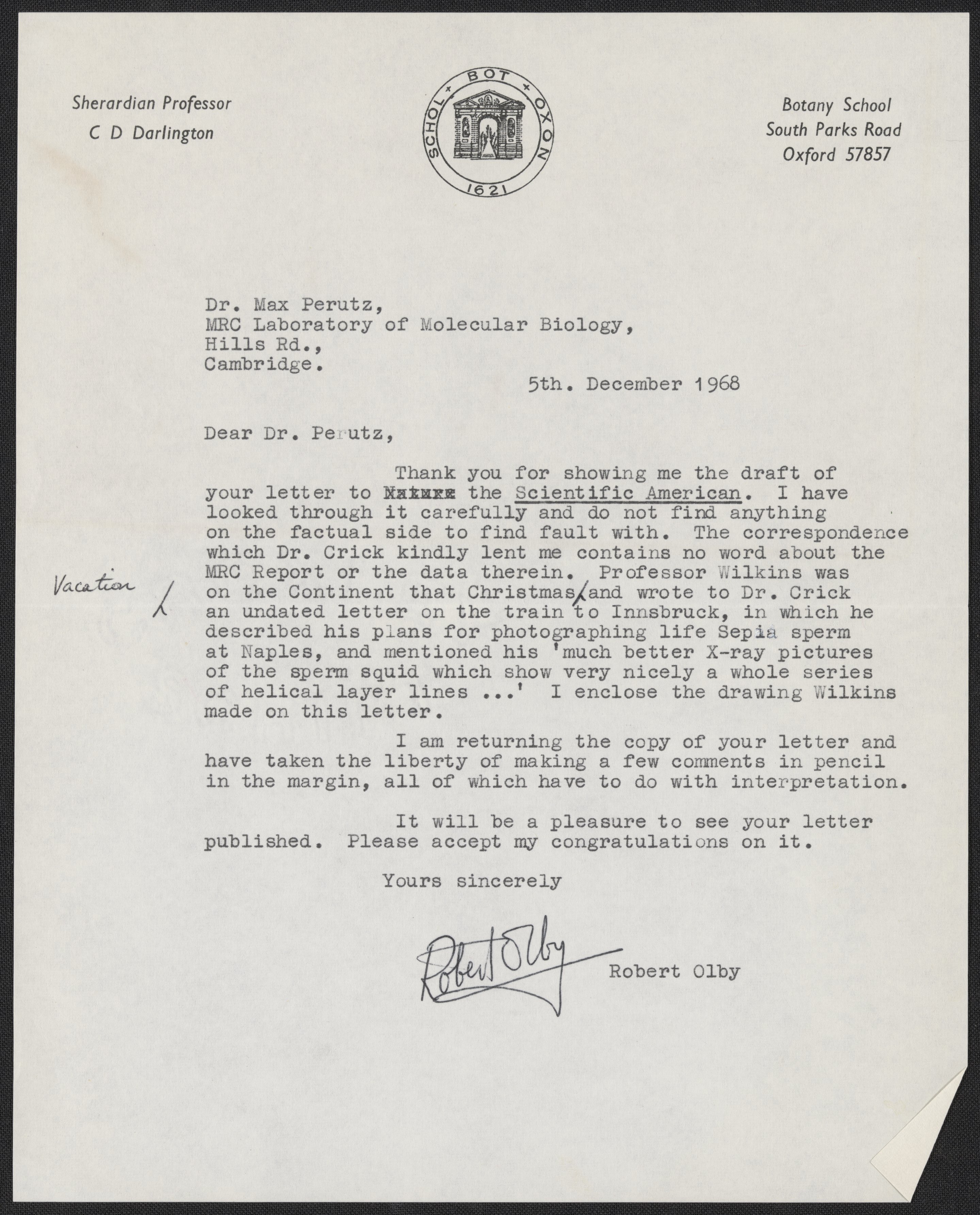 Letter from Robert Olby to Max Perutz, December 5, 1968