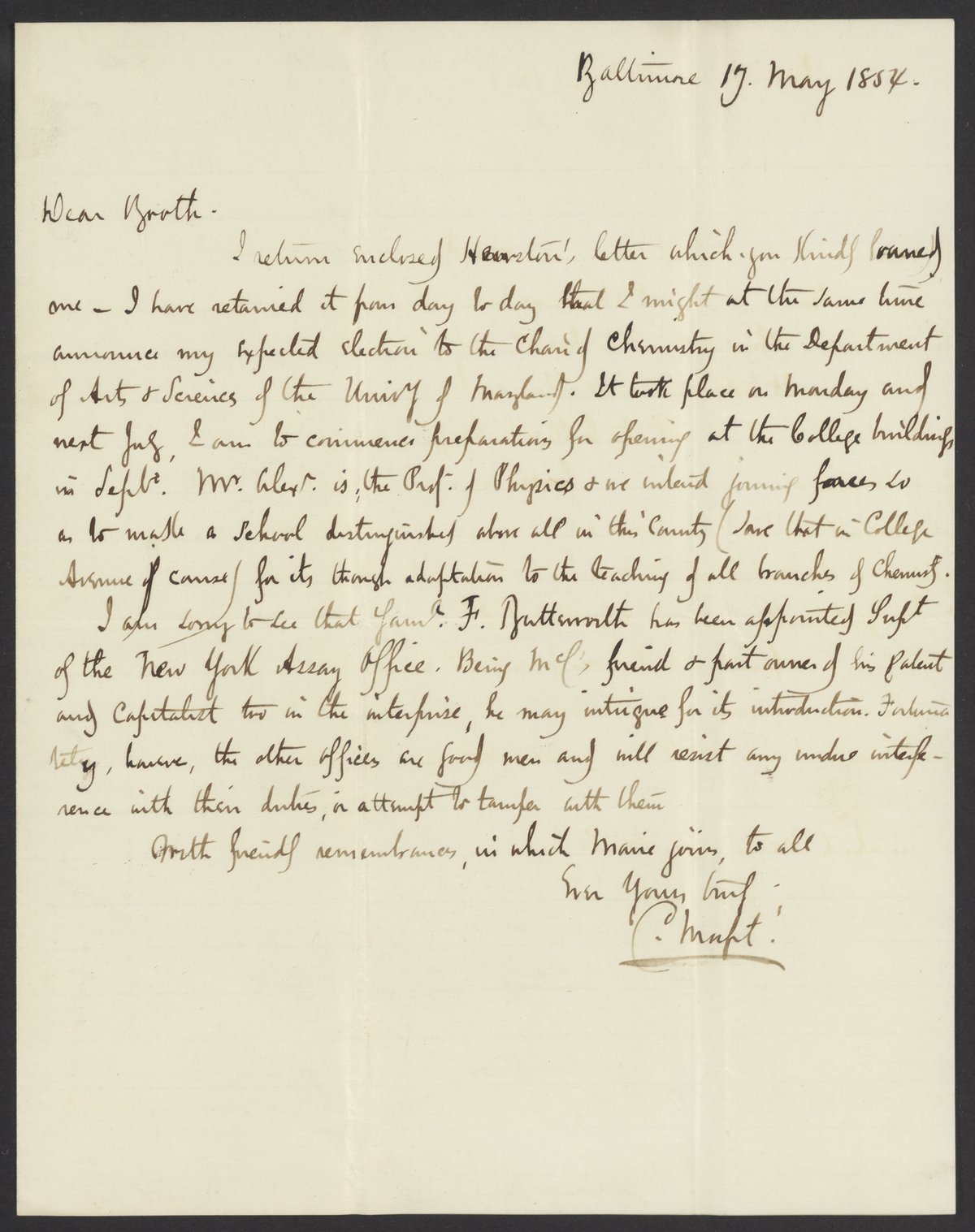 Small JPG1200 x 1517px — 219 KBFull-sized JPG2804 x 3545px — 828 KBOriginal fileTIFF — 2804 x 3545px — 28.5 MBCampbell Morfit (1820-1897), a distinguished chemist and co-editor with James Curtis Booth (1810-1888) of the Encyclopedia of Chemistry (1850), write to Booth to announce his election to the Chair of Chemistry at the University of Maryland.