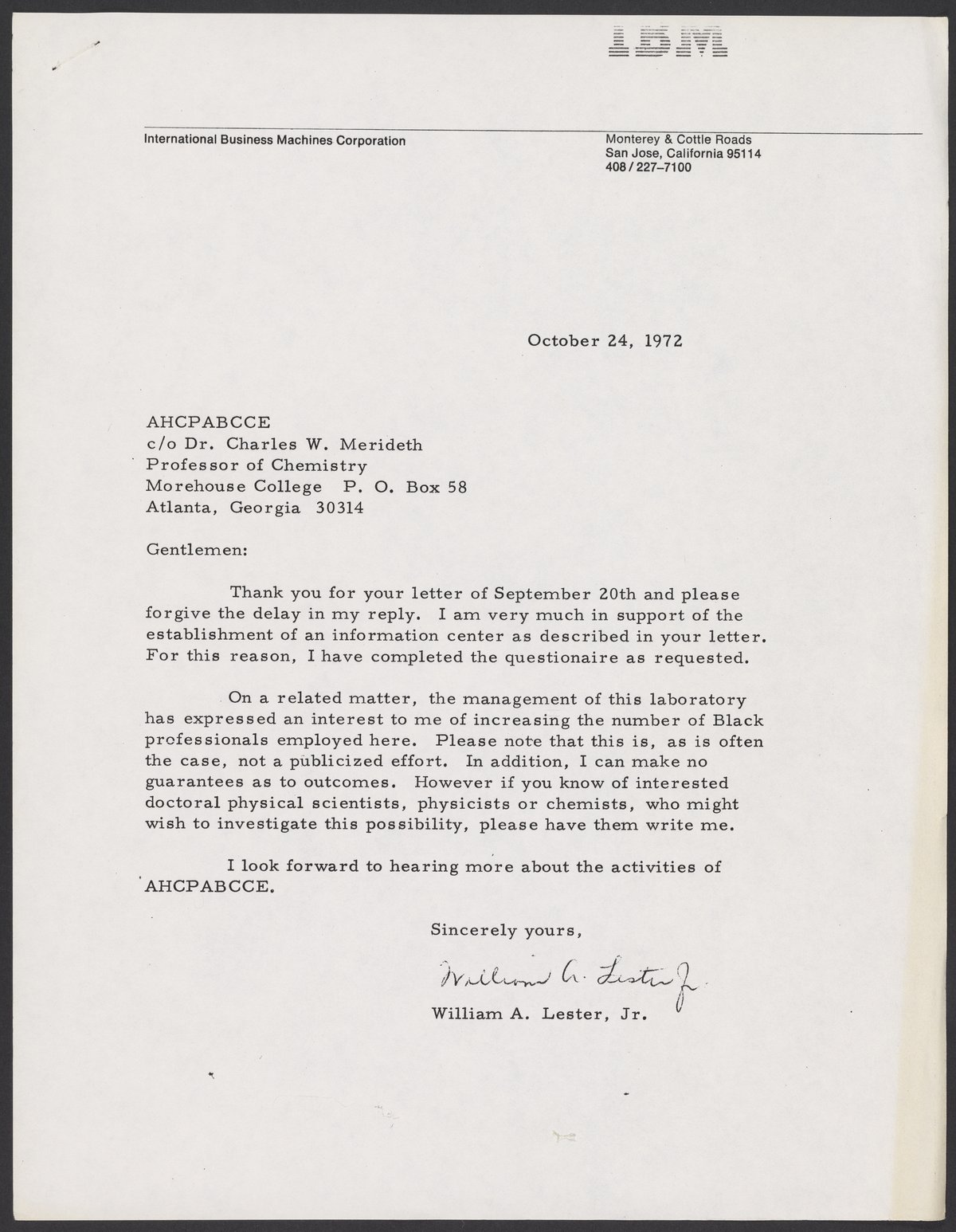 Lester, William A., Jr. “Letter from William A. Lester, Jr. to the Ad Hoc Committee for the Professional Advancement of Black Chemists and Chemical Engineers, October 1972,” October 24, 1972. William A. Lester, Jr. Papers, Box 44, Folder 18. Science History Institute. Philadelphia. https://digital.sciencehistory.org/works/xz6q1lo.