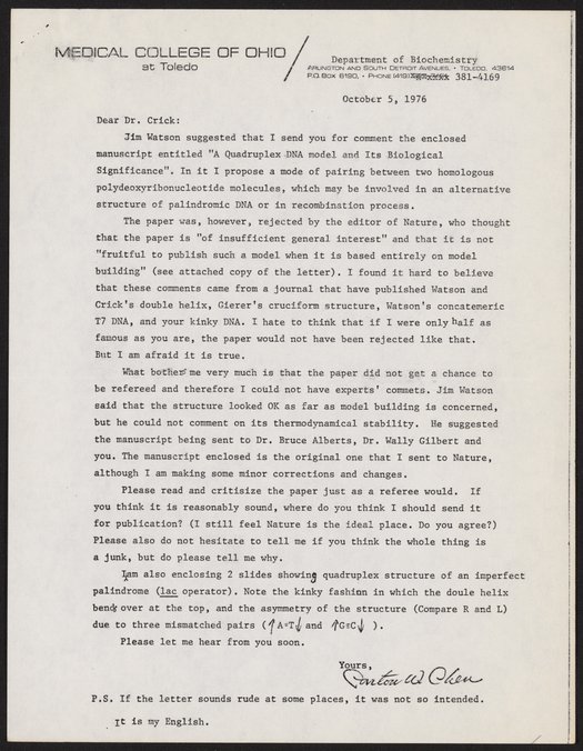 Chen, Carton W. “Letter from Carton W. Chen to Francis Crick, October 5, 1976,” October 5, 1976. History of Molecular Biology Collection, Box 19, Folder 25. Science History Institute. Philadelphia. https://digital.sciencehistory.org/works/xzgij7x.