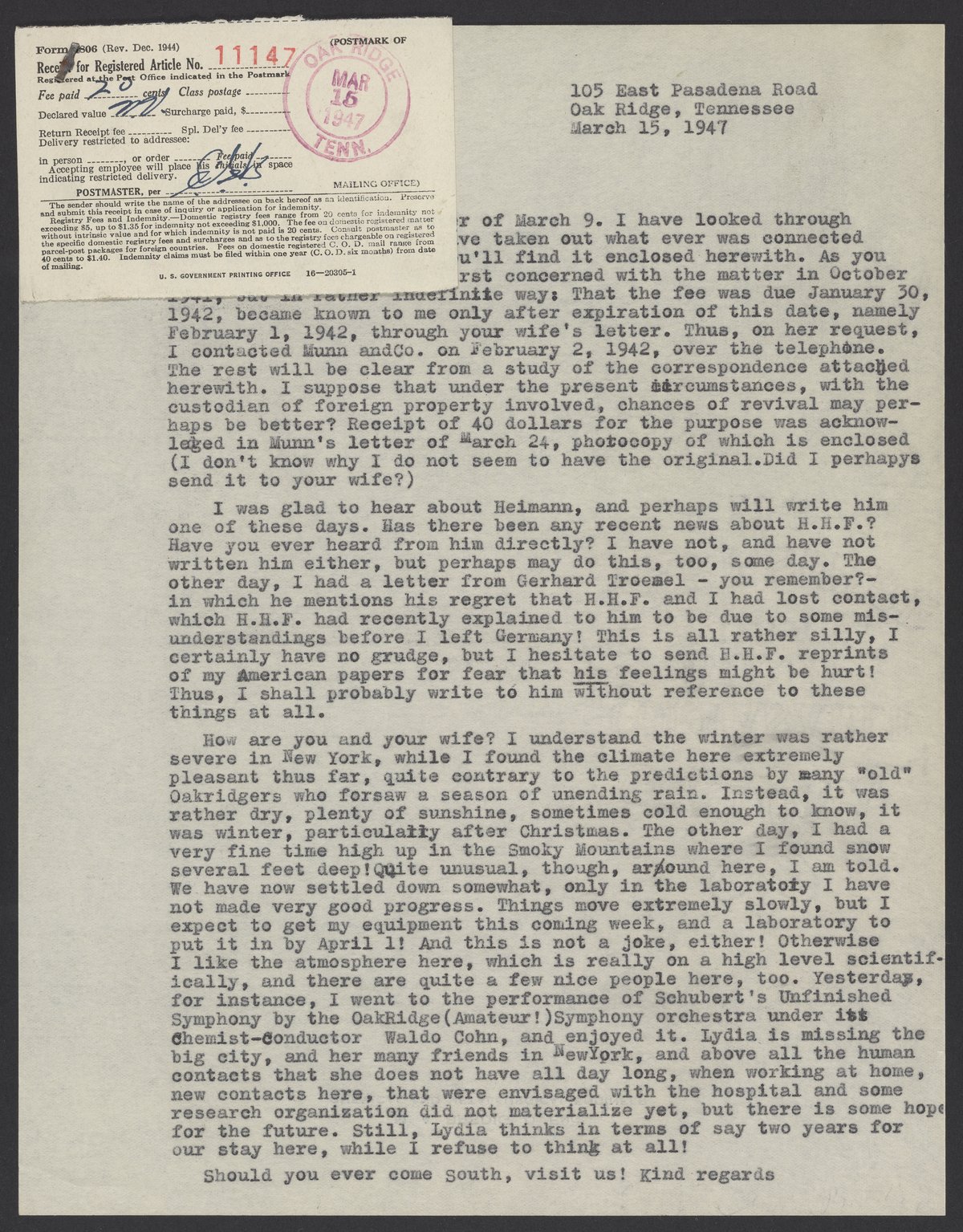 Letter from Max Bredig to Fritz Hochwald, March 15, 1947