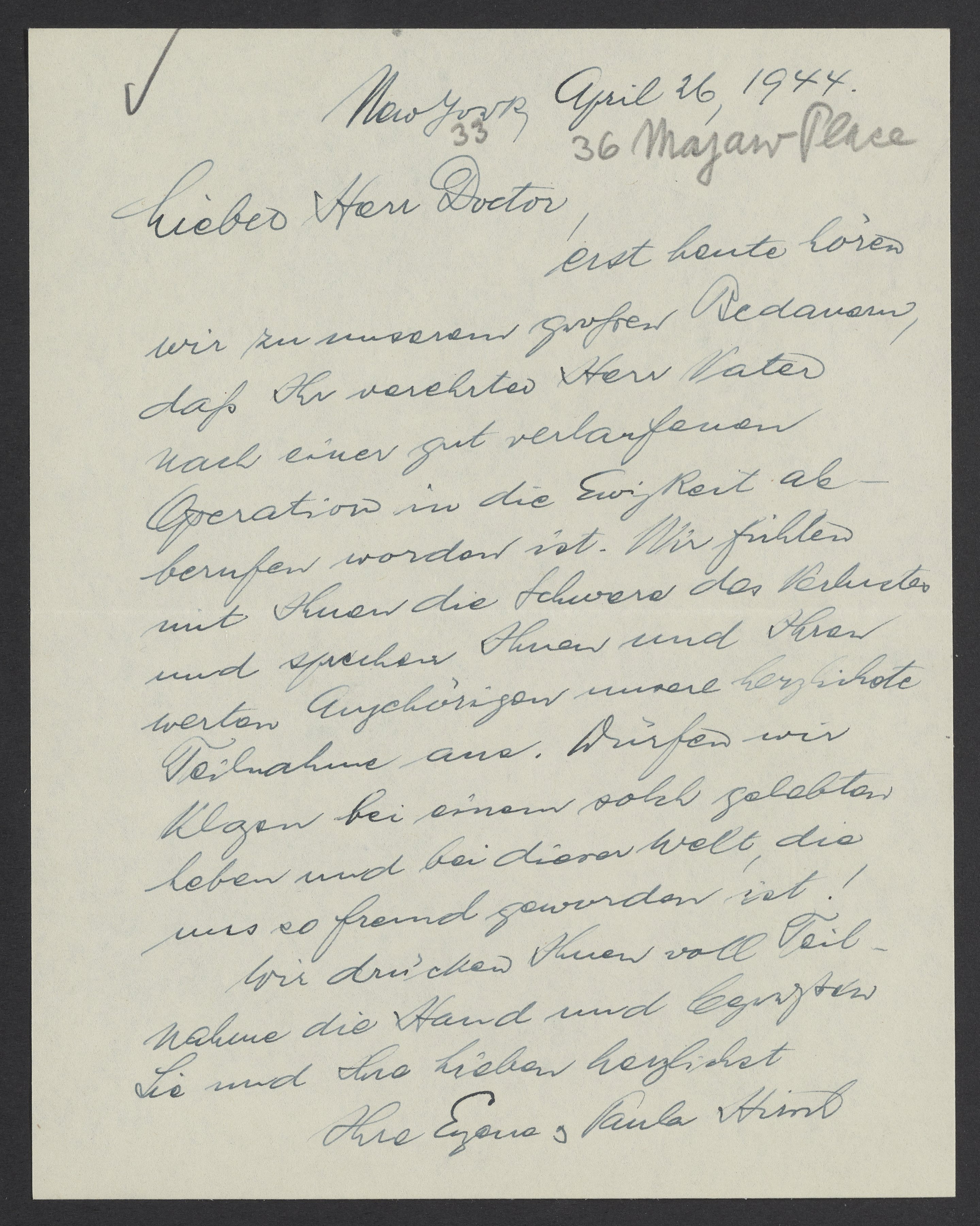 Letter of condolence from Eugene and Paula Hirsch to Max Bredig, April 16, 1944
