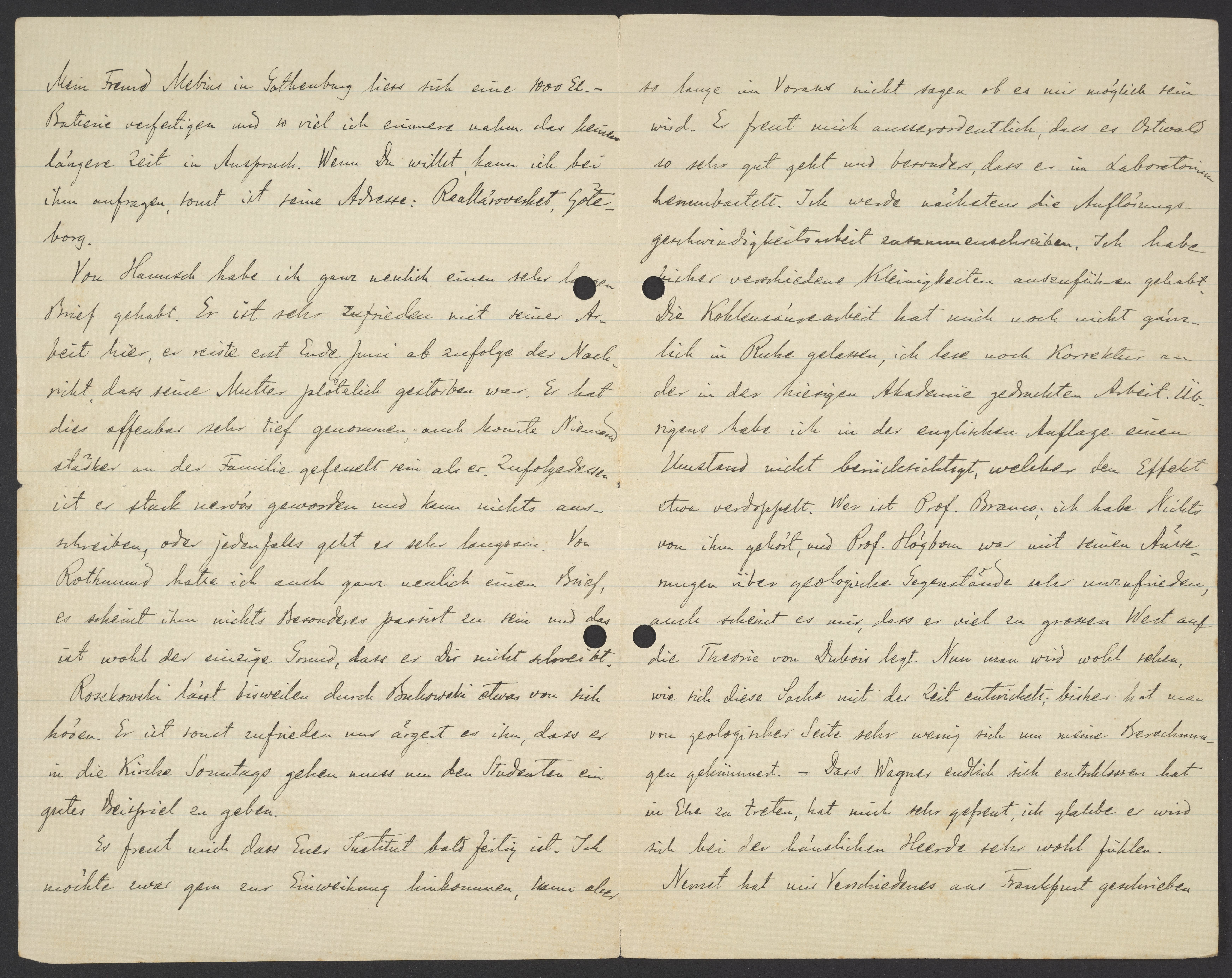 so lange im Voraus nicht sagen ob es mir möglich sein wird. Es freut mich ausserordentlich, dass es Ostwald so sehr gut geht und besonders, dass er im Laboratorium herumbastelt. Ich werde nächstens die Auflösungsgeschwindigkeitsarbeit zusammenschreiben. Ich habe hierher verschiedene Kleinigkeiten auszuführen gehabt. Die Kohlensäurearbeit hat mich noch nicht gänzlich in Ruhe gelassen, ich lese noch Korrektur an der in der hiesigen Akademie gedruckten Arbeit. Übrigens habe ich in der englischen Auflage einen Umstand nicht berücksichtigt, welcher den Effekt etwa verdoppelt. Wer ist Prof. Branco; ich habe Nichts von ihm gehört, und Prof. Hogborn war mit seinen Anstrengung über geologische Gegenstände sehr unzufrieden, auch scheint es mir, dass er viel zu grossen Wert auf die Theorie von Dubois legt. Nun man wird wohl sehen, wie sich diese Sache mit der Zeit entwickelt, bisher hat man von geologischer Seite sehr wenig sich um meine Berechnungen gekümmert. – Dass Wagner endlich sich entschlossen hat in Ehe zu treten, hat mich sehr gefreut, ich glaube er wird sich bei der häuslichen Heerde sehr wohl fühlen.