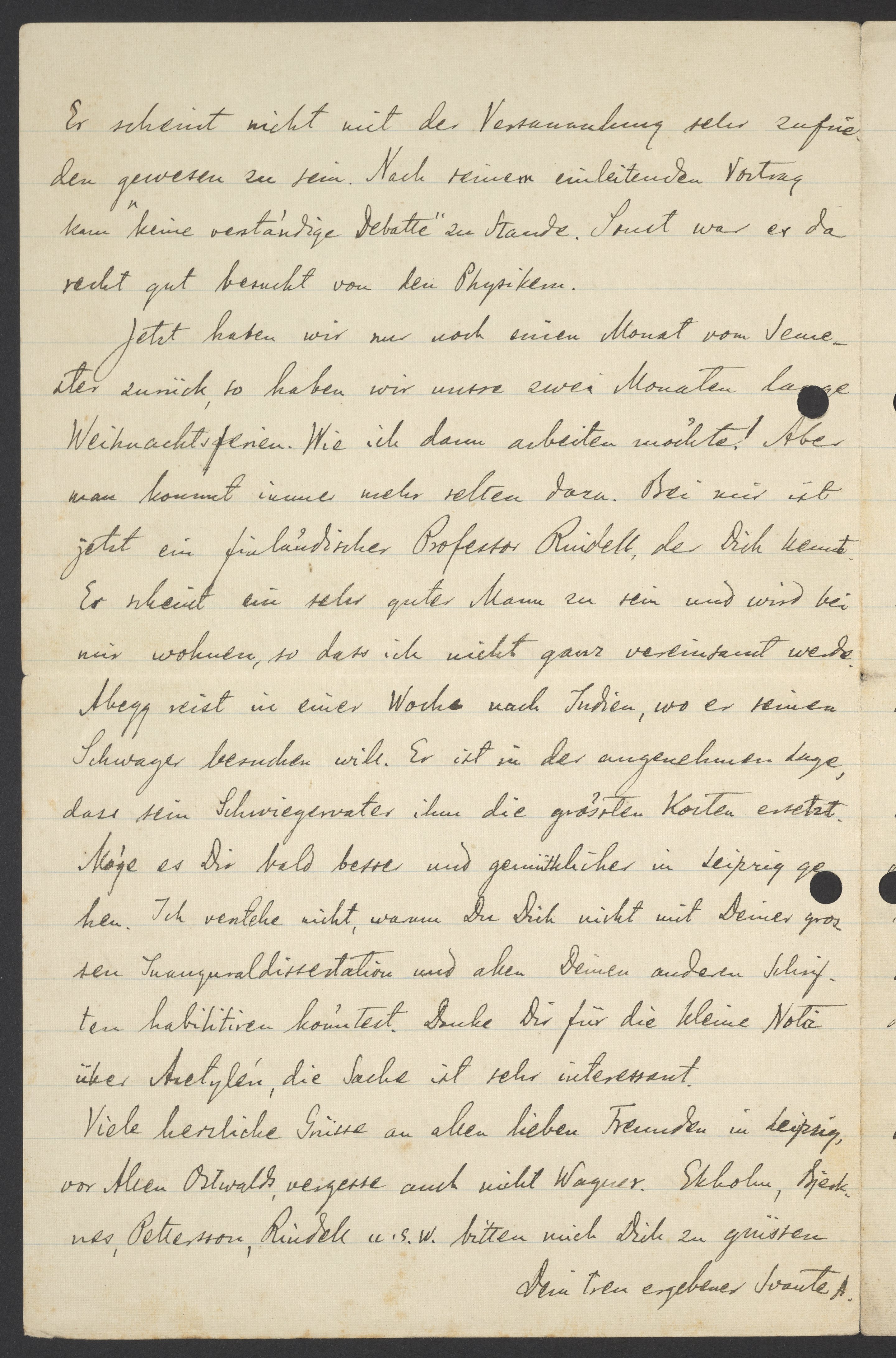 Viele herzliche Grüsse an allen lieben Freunden in Leipzig, vor Allem Ostwald, vergesse auch nicht Wagner, Ekholm, Bierkens, Pettersson, Rindell u.s.w bitten mich Dich zu grüssen.