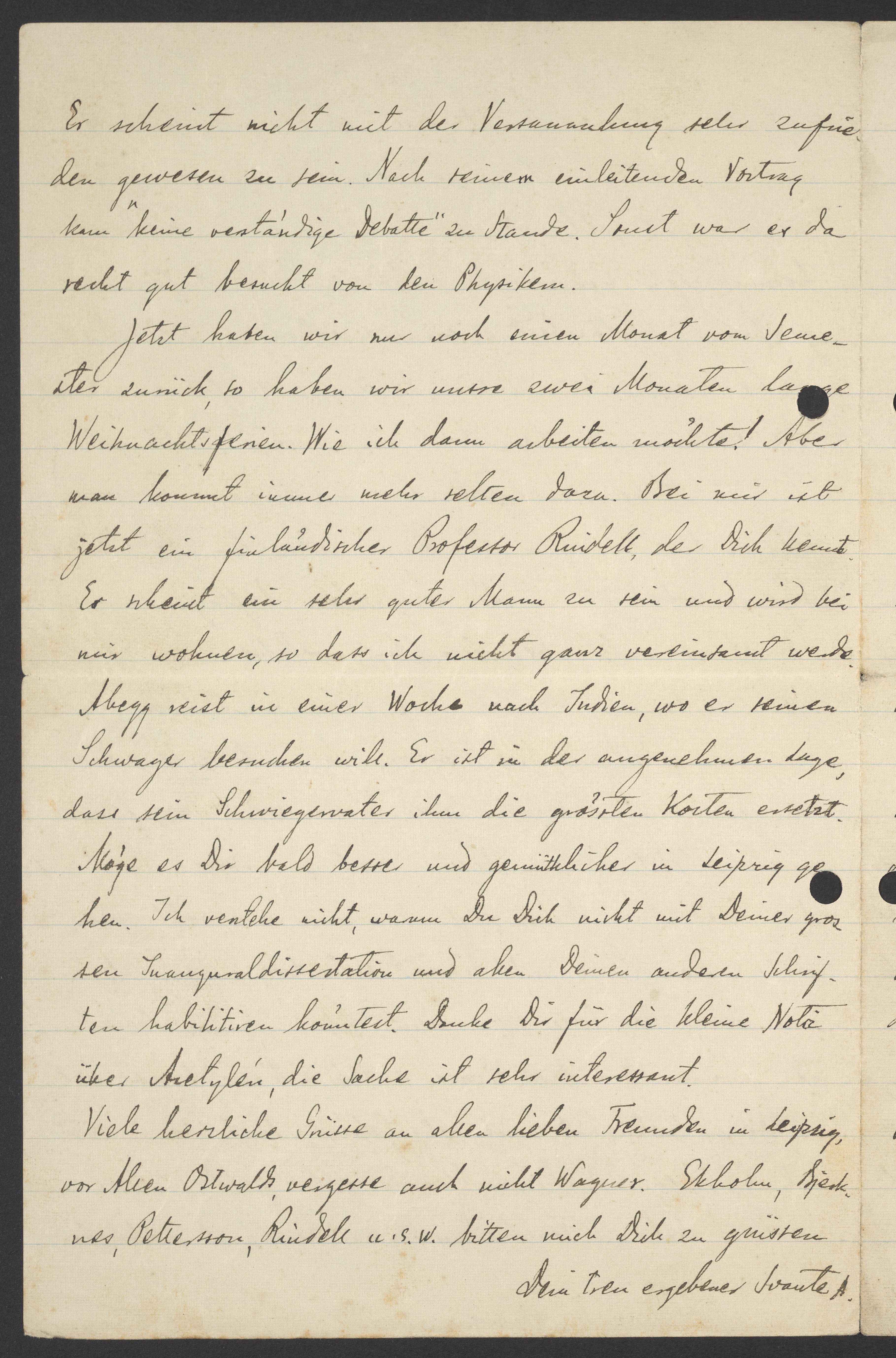 Viele herzliche Grüsse an allen lieben Freunden in Leipzig, vor Allem Ostwald, vergesse auch nicht Wagner, Ekholm, Bierkens, Pettersson, Rindell u.s.w bitten mich Dich zu grüssen.