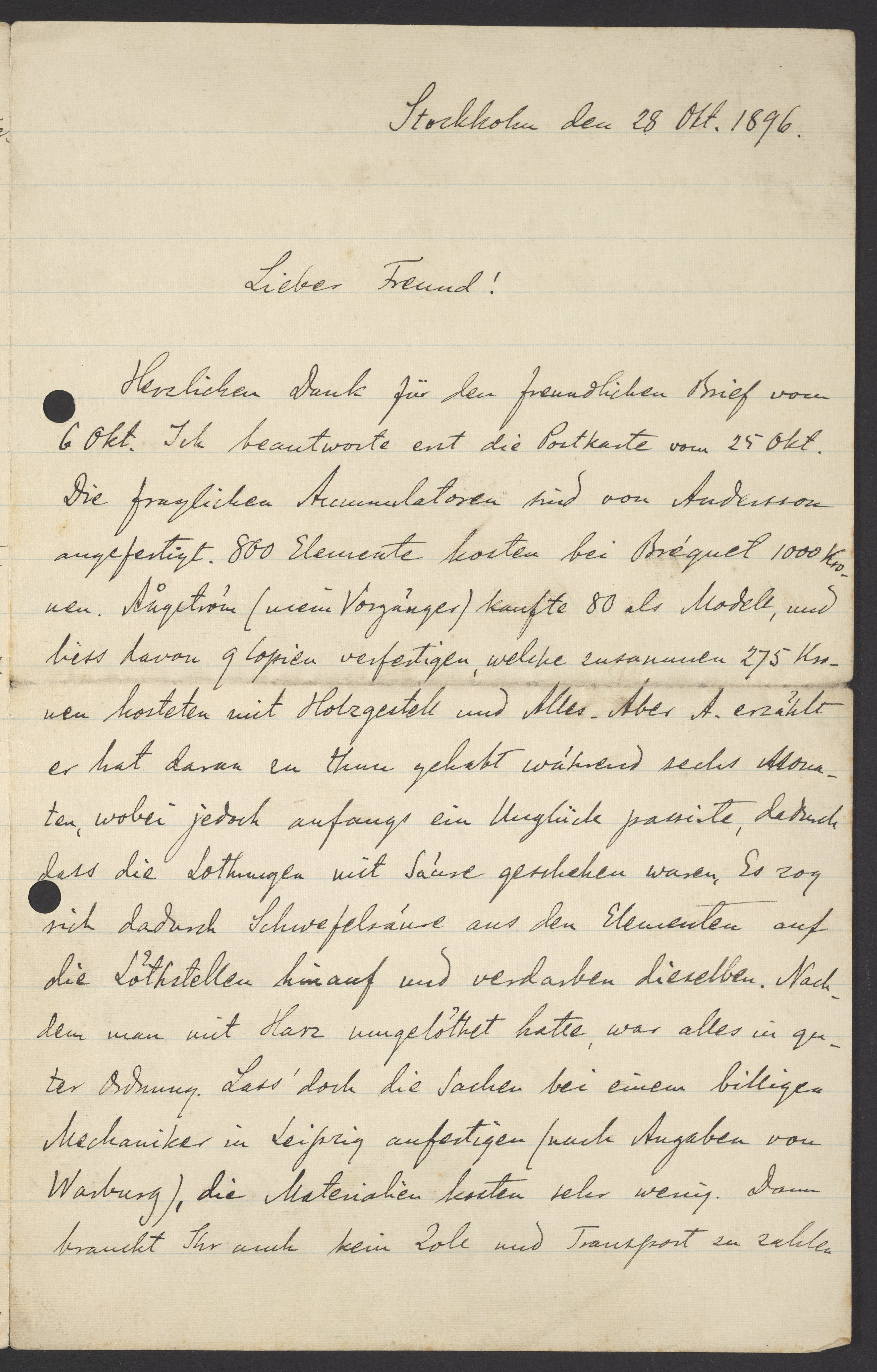 Herzlichen Dank für den freundlichen Brief vom 6. Okt. Ich beantworte erst die Postkarte vom 25 Okt. Die fraglichen Accumlatoren sind von Andersson angefertigt. 800 Elemente kosten bei Bréquet 1000 Kronen. Ångström (mein Vorgänger) kaufte 80 als Modelle, und liess 9 Copien verfertigen, welche zusammen 275 Kronen kosteten mit Holzgestell und Alles Aber A. erzählt er hat daran zu thun gehabt während sechs Monaten, wobei jedoch anfangs ein Unglück passierte, dadurch dass die Löthungen mit Saure geschehen waren. Er zog sich dadurch Schwefelsäure aus den Elementen auf die Löthstellen hinauf und verdarben dieselben. Nachdem man mit Harz umgelöthet, war alles in guter Ordnung. Lass‘ doch die Sachen bei einem billigen Mechaniker in Leipzig anfertigen (nach Angaben von Warburg), die Materialien kosten sehr wenig. Dann braucht Ihr auch kein Zoll und Transport zu zahlen
