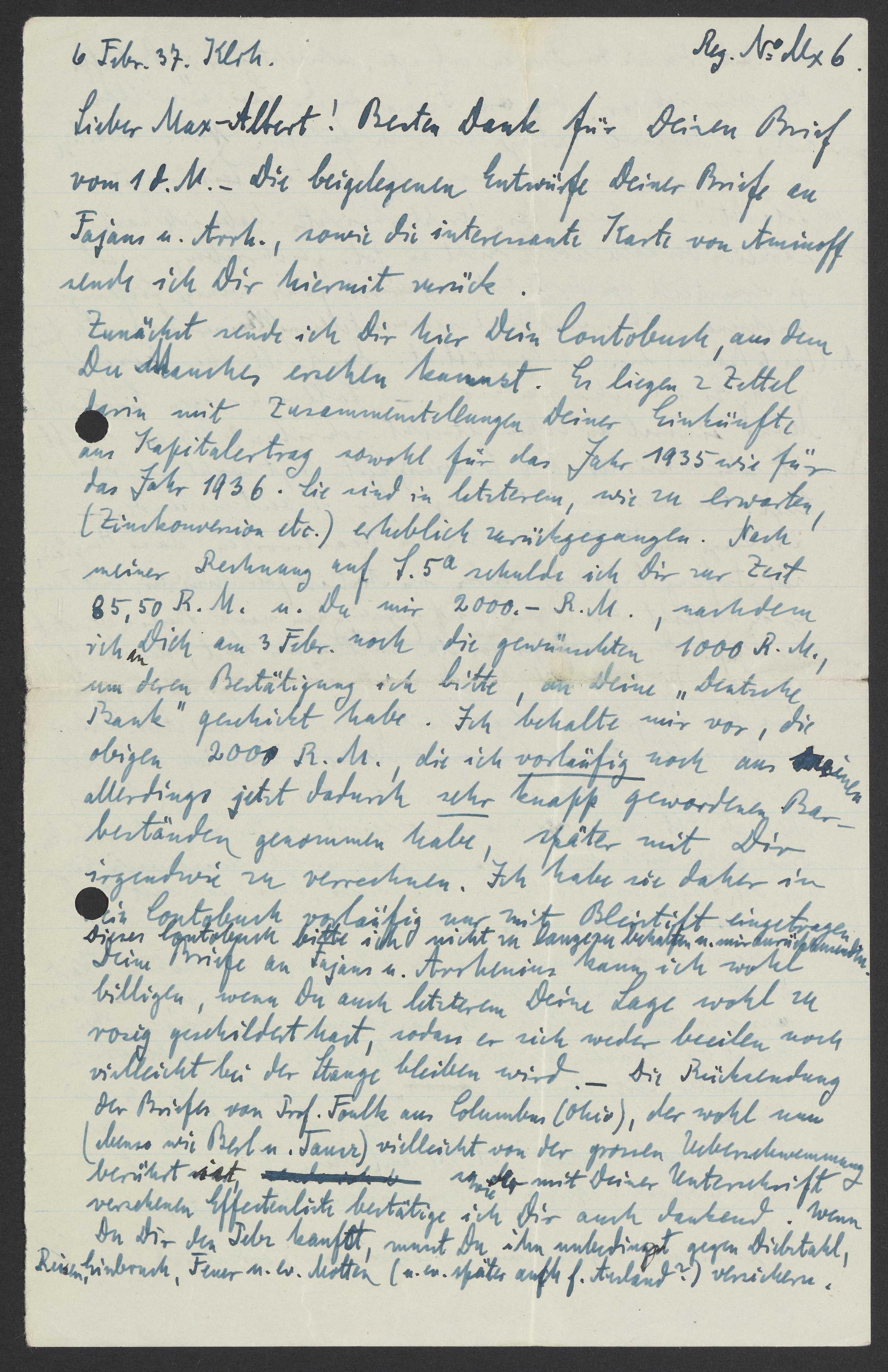 For the time being, I am returning your account book, in which you will see a few things. There are 2 slips of paper in it with summaries of your income from capital gains for both 1935 and 1936. As expected, they recently decreased significantly due to interest conversion etc. According to my calculations on page 5a, I currently owe you 85.50 Reichsmarks. Moreover, you owe me 2,000 Reichsmarks after I sent you the requested 1,000 Reichsmarks on February 3rd to your account at “Deutsche Bank.” Please confirm this. I reserve the right to settle the aforementioned 2,000 Reichsmarks with you later. I have temporarily taken them from my stock holdings. Hence, for the time being, I have only entered them in an account book in pencil. I ask that you don’t keep this account book and return it to me.
