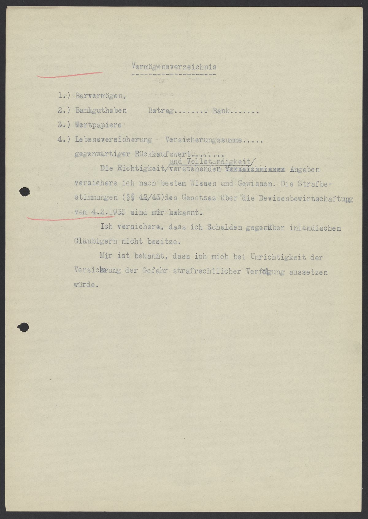 Die Richtigkeit und Vollständigkeit vorstehenden Angabe versichere ich nach bestem Wissen und Gewissen. Die Strafbestimmung (42/43) des Gesetzes über die Devisenbewirtschaftung vom 4.2.1935 sind mir bekannt.