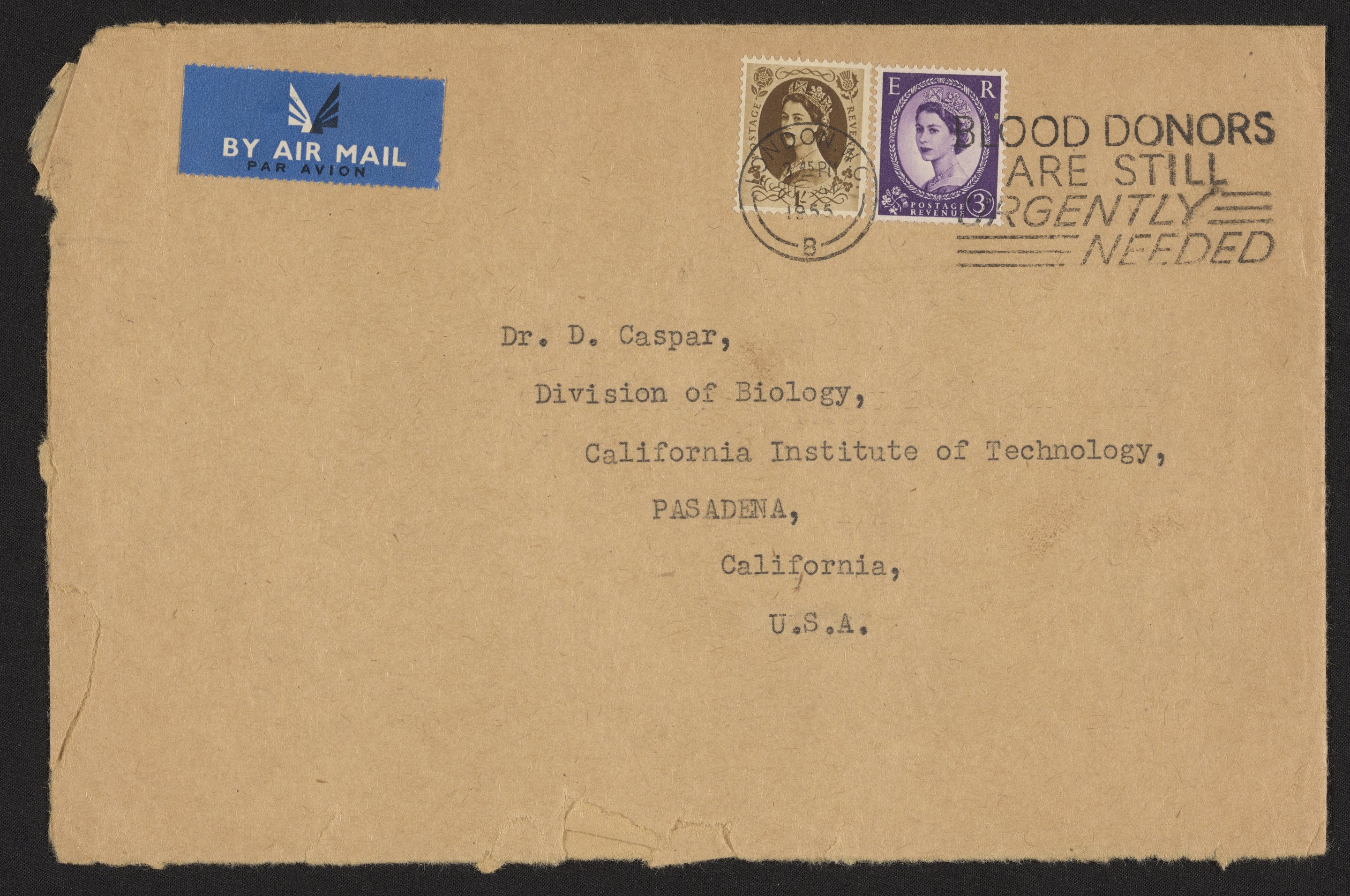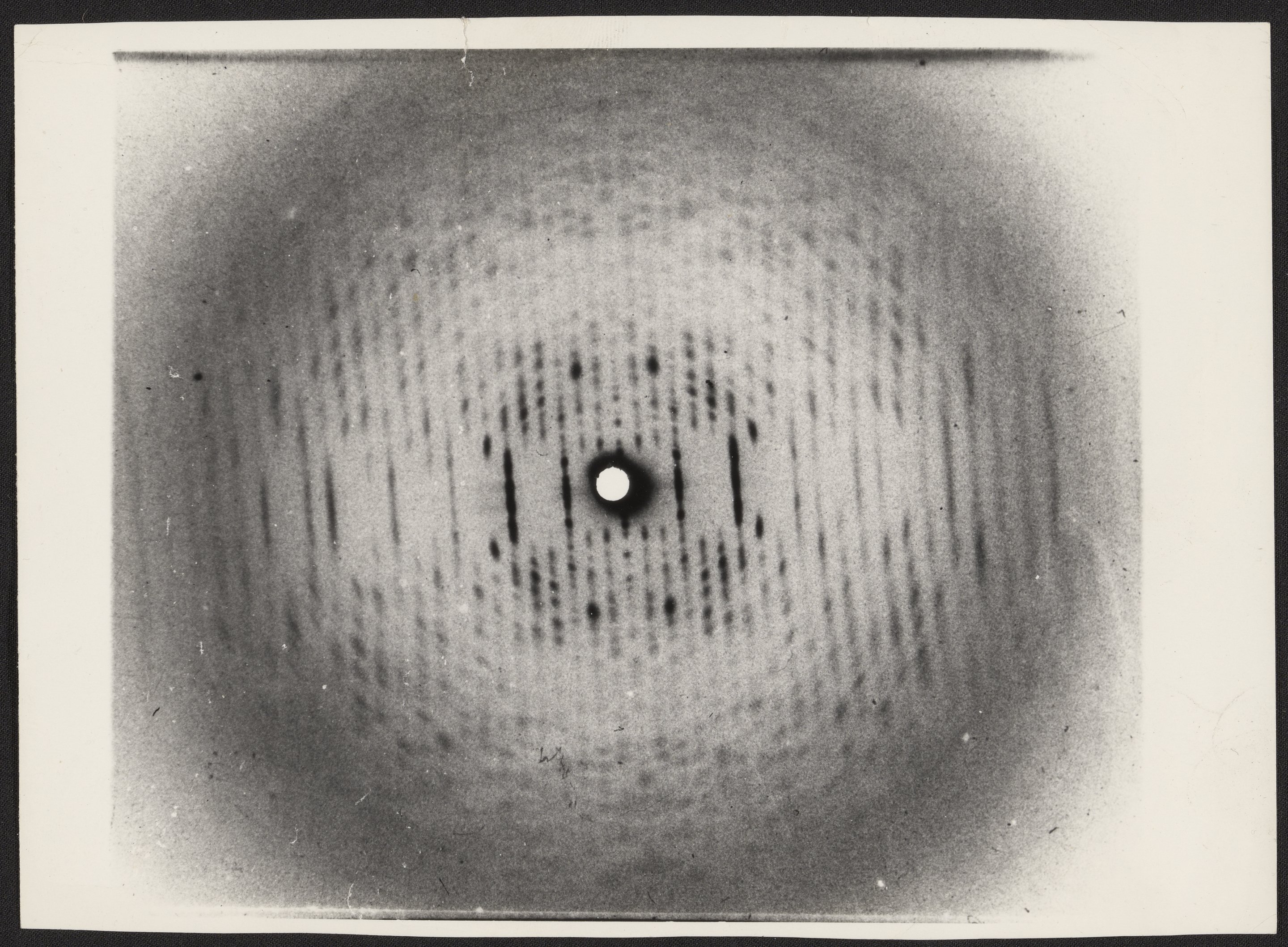Small JPG1200 x 1528px — 289 KBLarge JPG2880 x 3667px — 1.6 MBFull-sized JPG5050 x 6430px — 4.7 MBOriginal fileTIFF — 5050 x 6430px — 92.9 MBEnvelope, letter, and photographic print sent from Rosalind Franklin (1920-1958) to Donald Caspar (1927-2021). Franklin welcomes Caspar's imminent arrival at Birkbeck in September and includes a print of the x-ray diffraction pattern of the tobacco mosaic virus (TMV). Between 1955–1956 Caspar worked with Franklin at Birkbeck College in London. He remained one of Franklin's closest friends during her lifetime. In 1956 they published individual but complementary papers in Nature, together showing that TMV was a hollow rod, rather than a solid structure as generally believed.