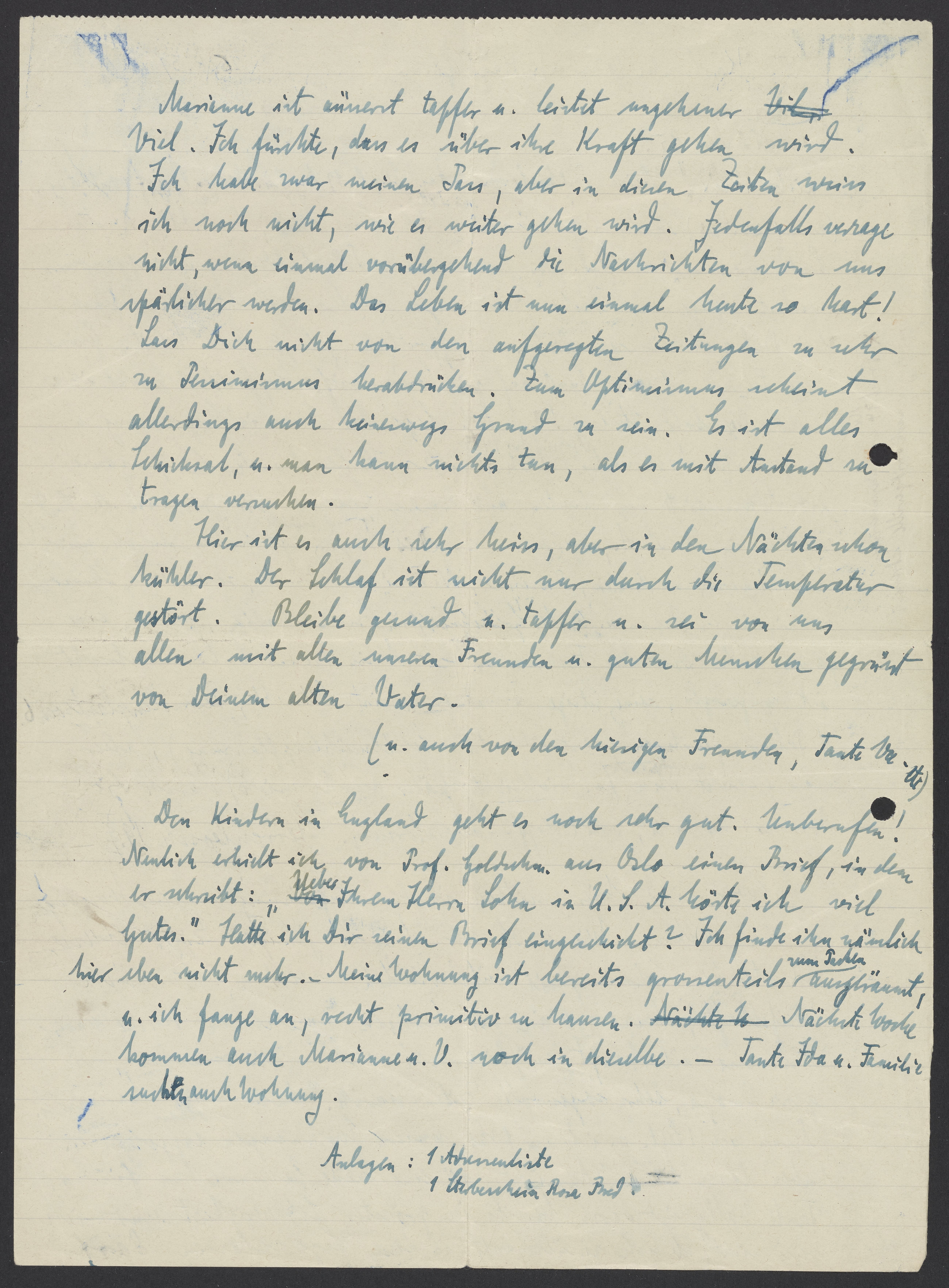 Marianne ist äusserst tapfer u. leistet ungeheuer viel. Ich fürchte, dass es über ihre Kraft gehen wird. Ich habe zwar meinen Pass, aber in diesen Zeiten weiss ich noch nicht, wie es weiter gehen wird. Jedenfalls verzage nicht, wenn einmal vorübergehend die Nachrichten von uns spärlicher werden. Das Leben ist nun einmal heute so hart! Lass Dich nicht von den aufgeregten Zeitungen zu sehr zu Pessimismus herabdrücken. Zum Optimismus scheint allerdings auch keineswegs Grund zu sein. Es ist alles Schicksal, u. man kann nichts tun, als es mit Anstand zu tragen versuchen.