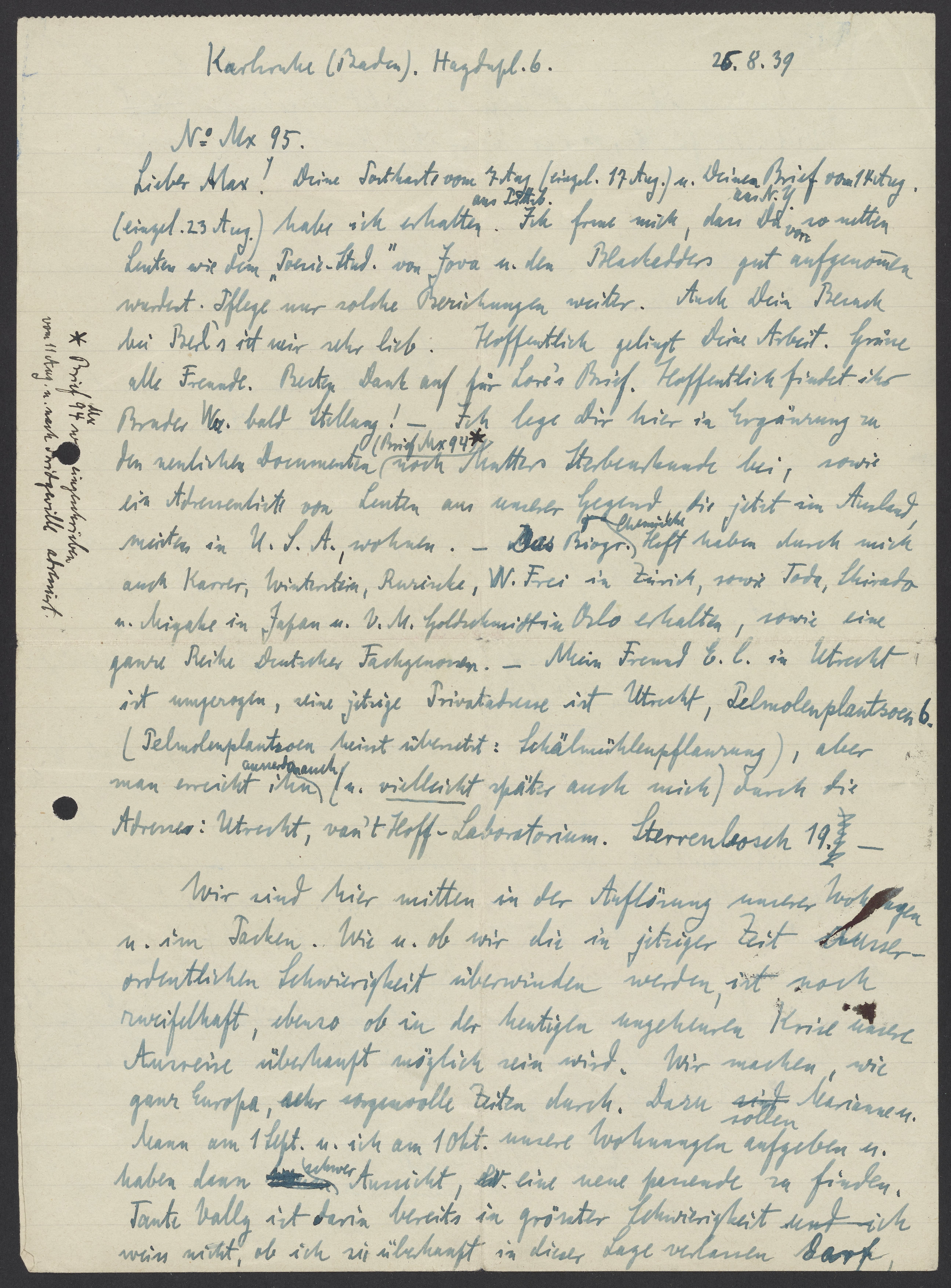 Lieber Max! Deine Postkarte vom 7 Aug aus Pittsburgh (eigel. 17 Aug.) u. Deinen Brief aus N.Y. vom 14 Aug (eingel. 23 Aug.) habe ich erhalten. Ich freue mich, dass Du von so netten Leuten wie dem „Poesie Stud.“ von Iowa u. den Blackadder gut aufgenommen wurdest. Pflege nur solche Beziehungen weiter. Auch Dein Besuch bei Berl’s ist mir sehr lieb. Hoffentlich gelingt Deine Arbeit. Grüsse alle Freunde. Besten Dank auch für Lore’s Brief. Hoffentlich findet ihr Bruder Wal. bald Stellung! – Ich lege Dir hier in Ergänzung zu den neulichen Documenten (Brief Mx 94*) Mutters Sterbekunde bei; sowie eine Adressenliste von Leuten aus unserer Gegend, die jetzt im Ausland, meistens in U.S.A., wohnen. – Das Biogr. Chemische Heft haben durch mich auch Karrer, Winterstein, Ruzicka, W. Frei in Zürich, sowie Toda, Shirado u. Miyake in Japan u. V.M. Goldschmidt in Oslo erhalten, sowie eine ganze Reihe Deutscher Fachgenossen. – Mein Freund E.C. in Utrecht ist umgezogen, seine jetzige Privatadresse ist Utrecht, Pelmolenplantsoen 6. (Pelmolenplantsoen heisst übersetzt: Schälmühlenpflanzung), aber man erreicht ausserdem auch ihn (u. vielleicht später auch mich) durch die Adresse: Utrecht, van’t Hoff-Laboratorium. Sterrenbosch 19.
