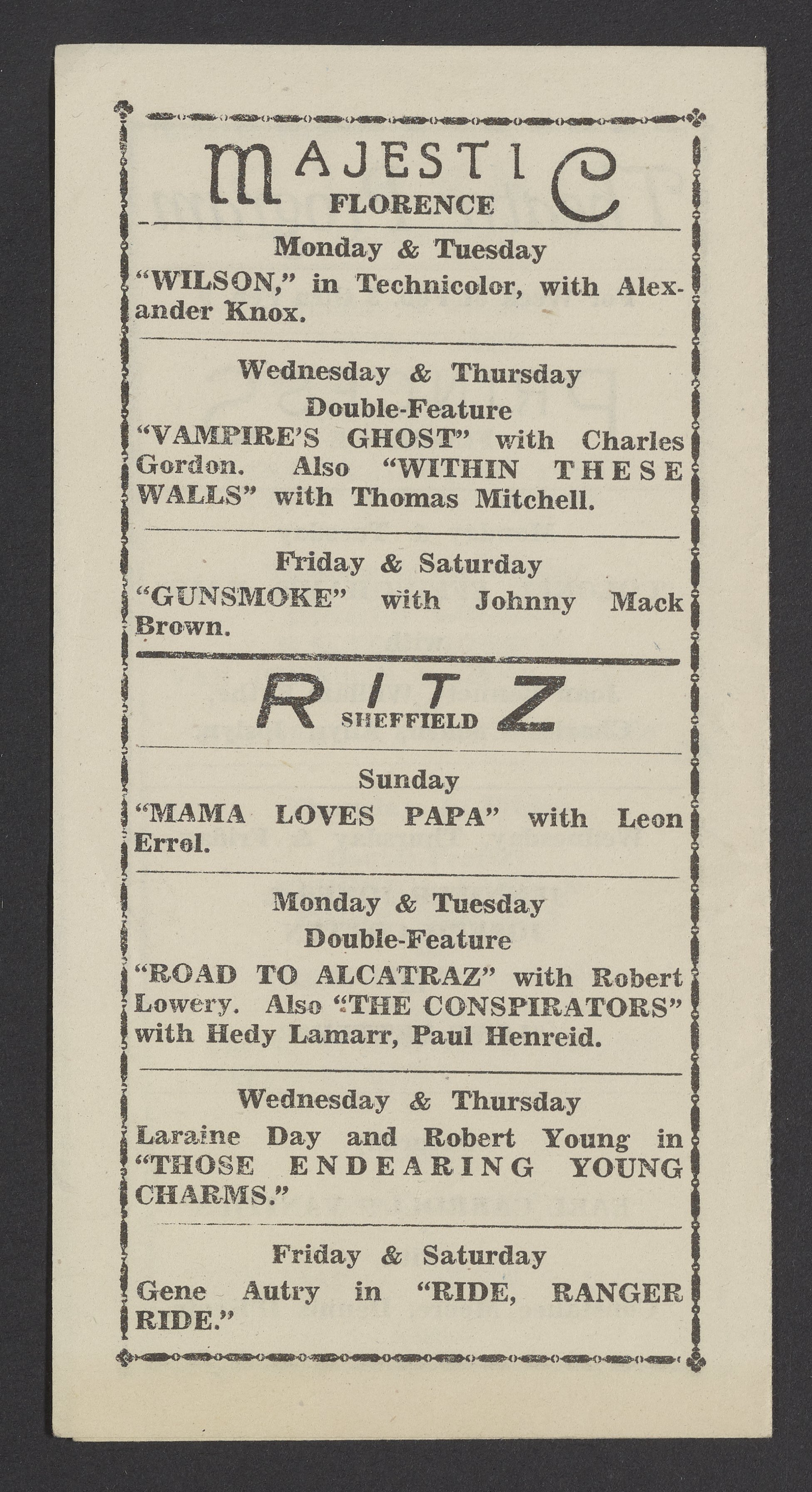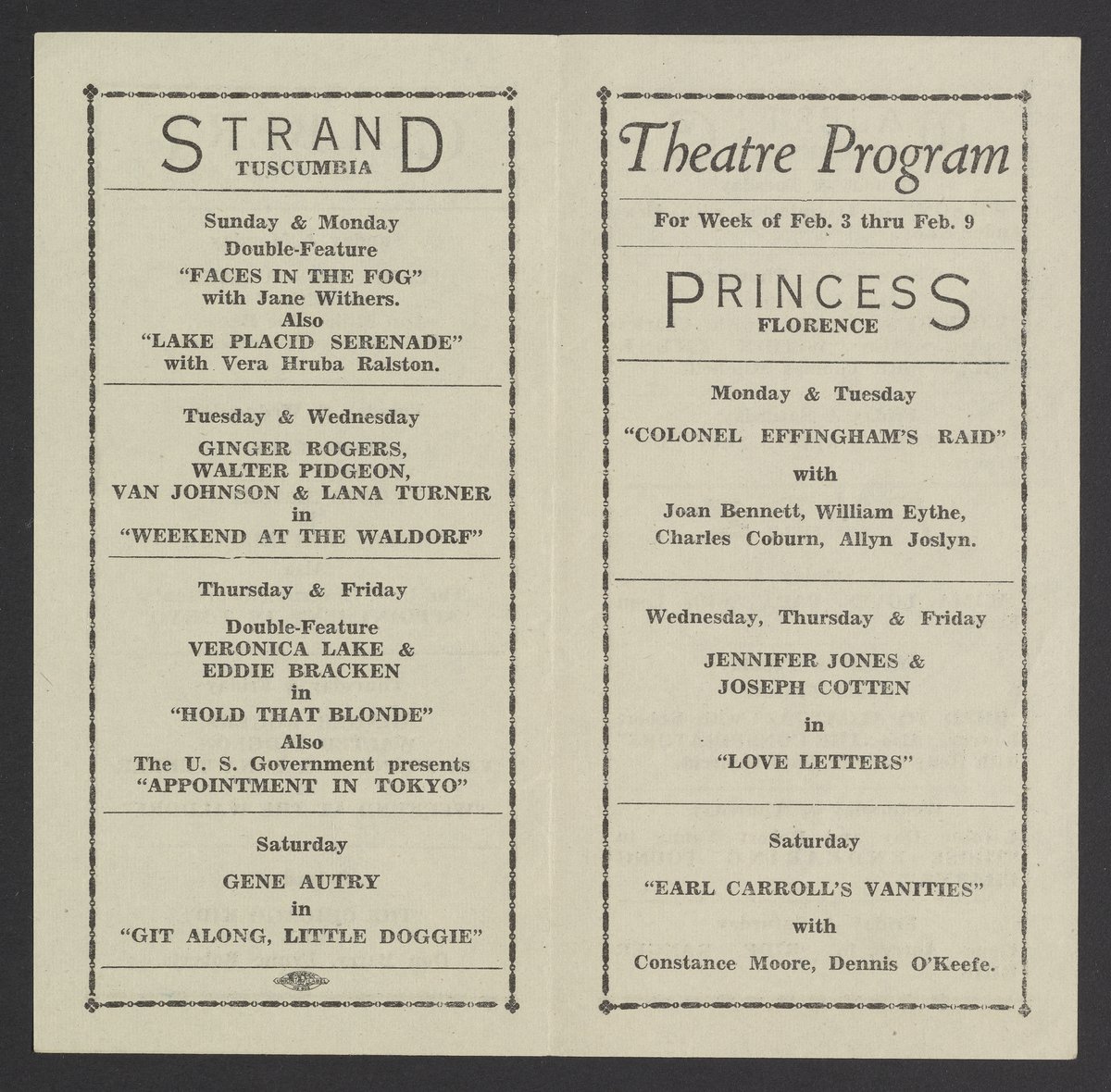 Pamphlet of movie times in theaters in Sheffield, Tuscumbia and Florence, Alabama. The schedule includes movies being show and double features.