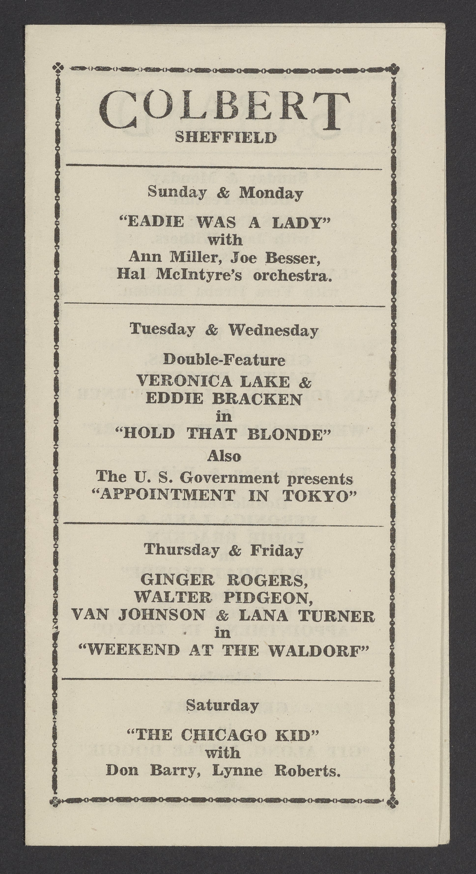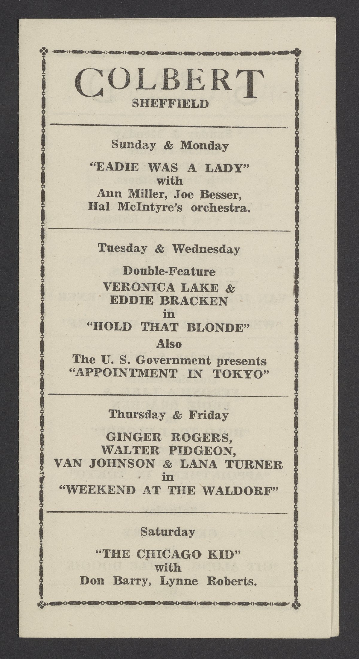 “List of Film Productions Showings in Local Theaters,” circa 1946. Papers of Georg and Max Bredig, Box 10, Folder 34. Science History Institute. Philadelphia. https://digital.sciencehistory.org/works/y874nhj.