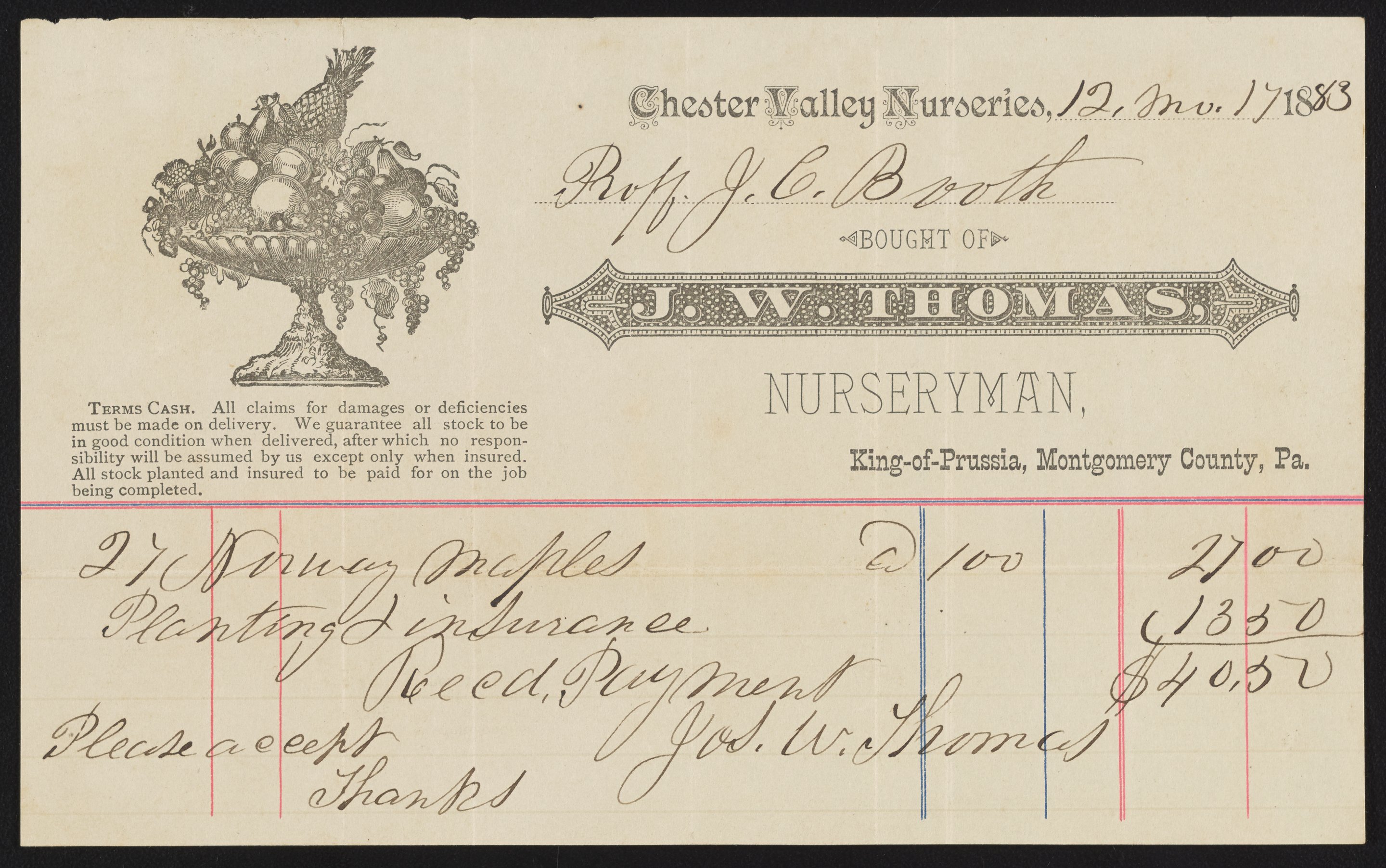 Thomas, Joseph W. “Receipt from J.W. Thomas of Chester Vallery Nurseries,” December 17, 1883. Papers of James Curtis Booth, Box 2, Folder 10. Science History Institute. Philadelphia. https://digital.sciencehistory.org/works/y8kw7r7.