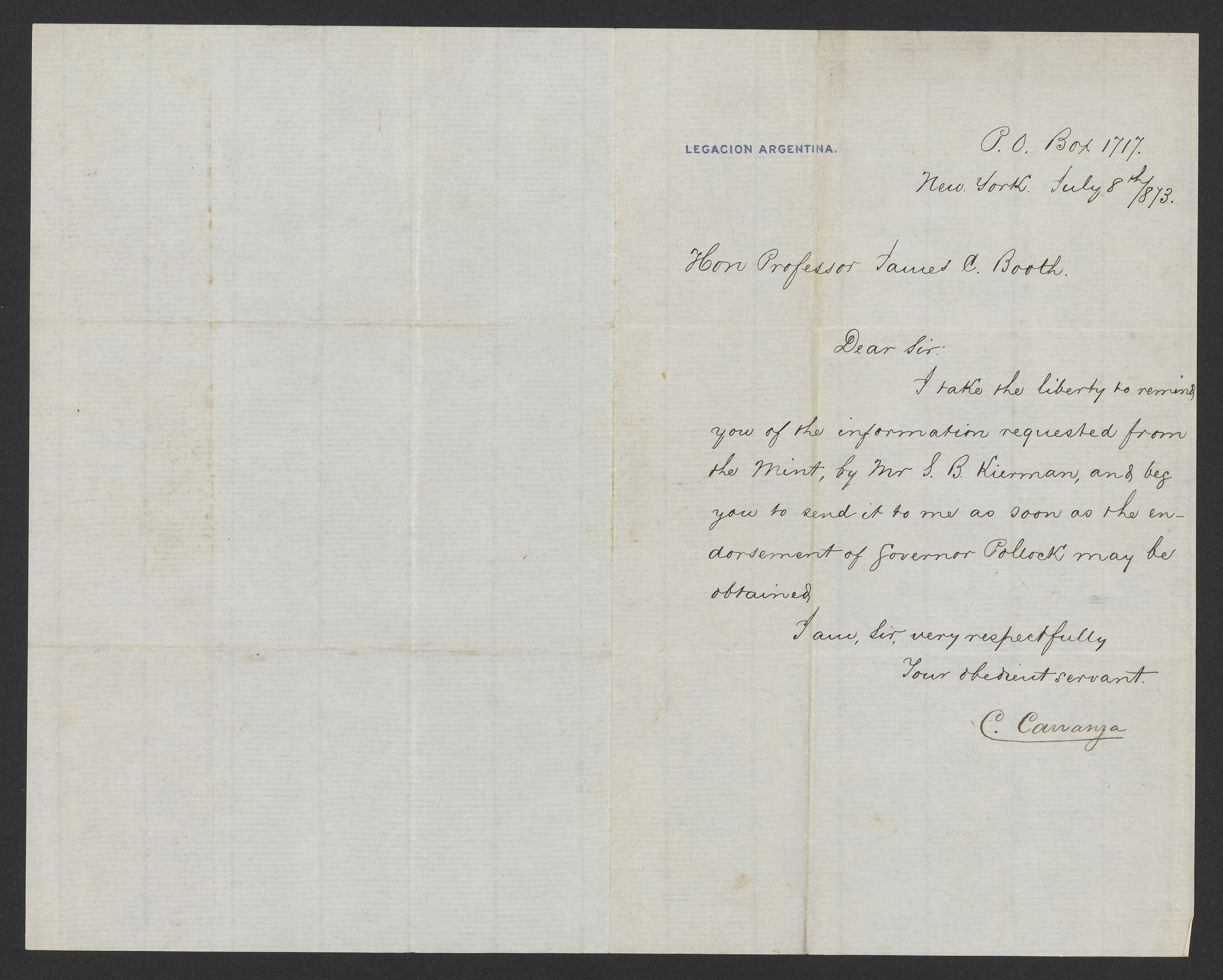 C. Carranza follows up from S. B. Kiernan's letter to James Curtis Booth (1810-1888) of June 30th to request information concerning the reliability of a private mint.