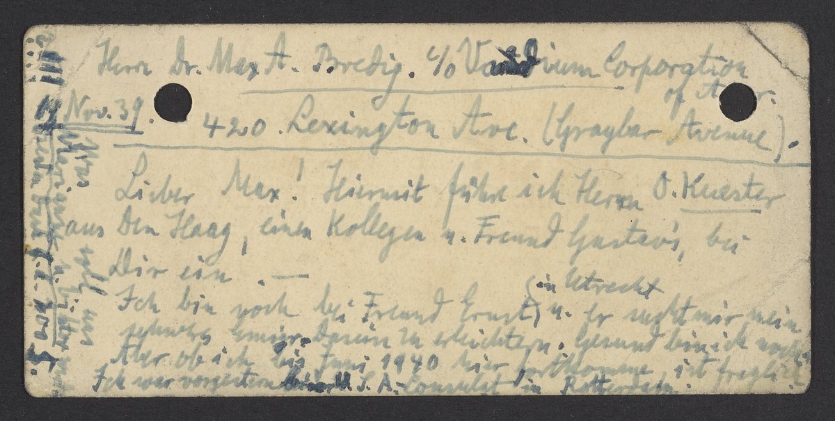 Small JPG1200 x 611px — 142 KBFull-sized JPG2838 x 1446px — 668 KBOriginal fileTIFF — 2838 x 1446px — 11.8 MBGeorg Bredig (1868-1944) writes a note to his son, Max Bredig (1902-1977), who resides in New York City. He updates Max on his life in exile in the Netherlands as he waits to depart for the U.S.A, including his financial situation and the status of his American visa.