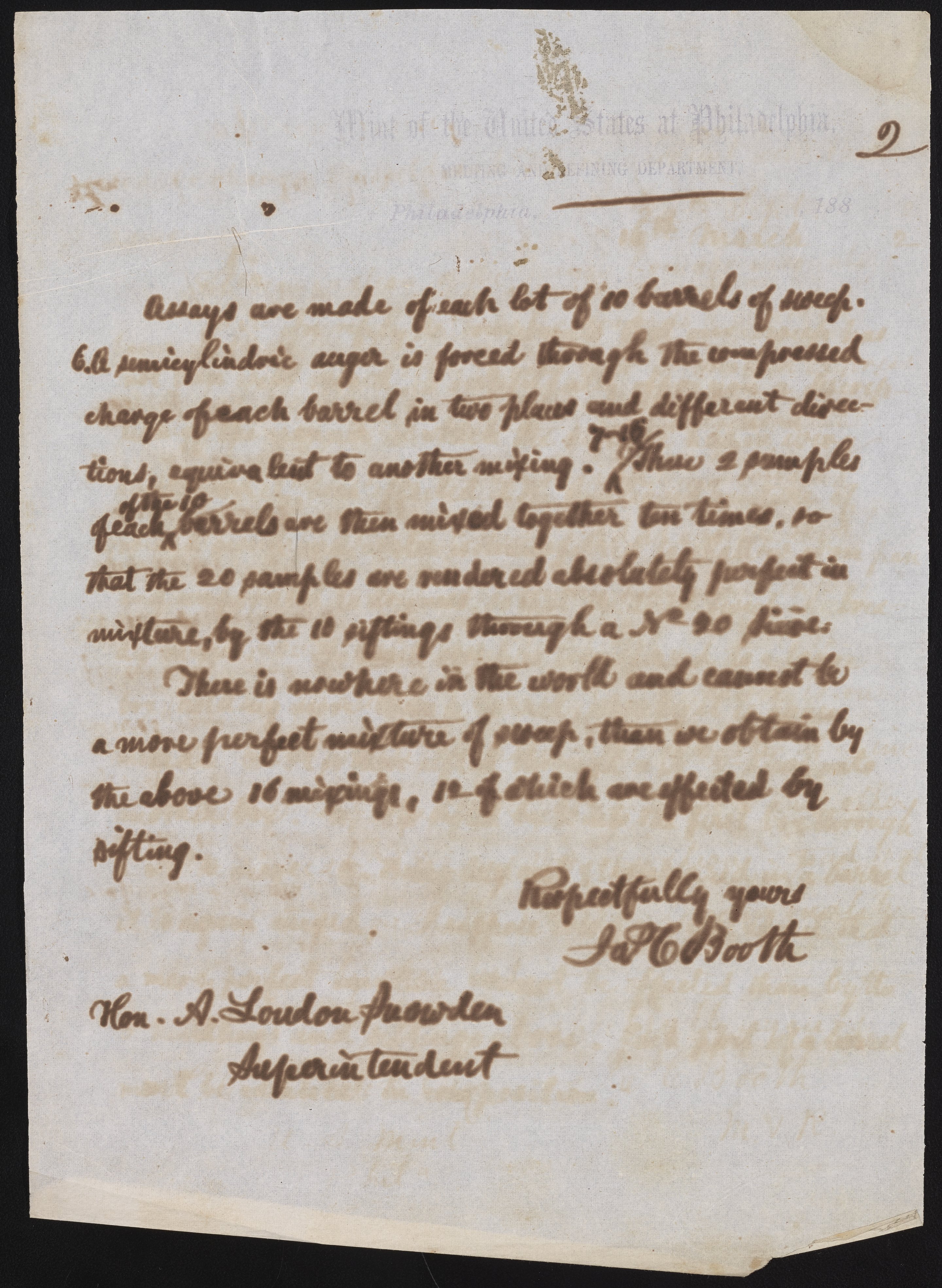 Small JPG1200 x 1659px — 356 KBLarge JPG2880 x 3982px — 2.1 MBFull-sized JPG4622 x 6390px — 5.0 MBOriginal fileTIFF — 4622 x 6390px — 84.6 MBJames Curtis Booth (1810-1888) writes to Archibald Loudon Snowden (1835-1912), Superintendent of the United States Mint at Philadelphia from 1879 to 1885, to discuss the technique used in the treatments of sweeps.
