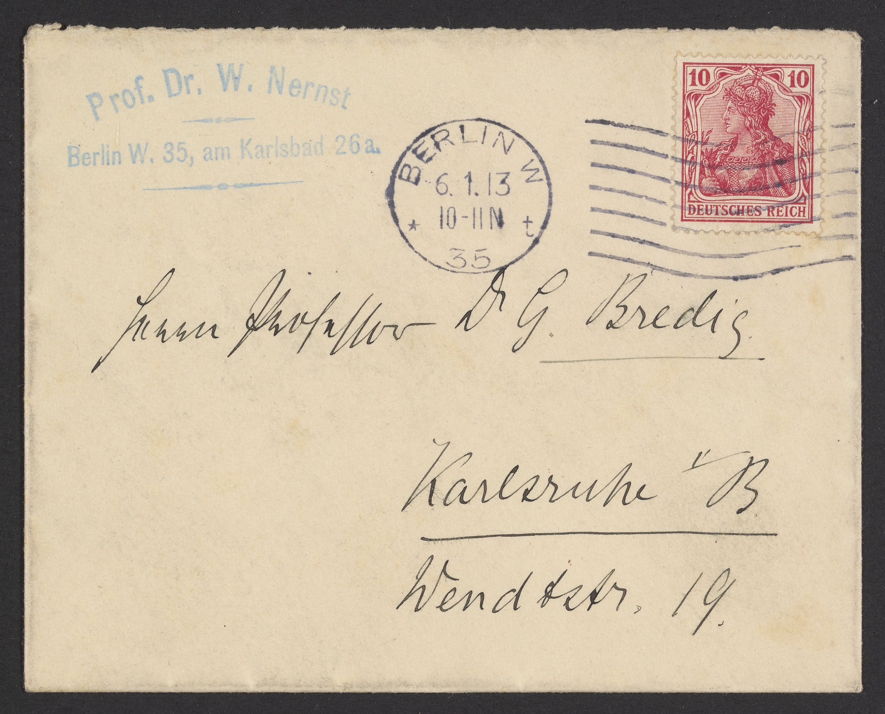 Nernst, Walther. “Envelope Addressed to Georg Bredig Sent from Walther Nernst,” January 6, 1913. Papers of Georg and Max Bredig, Box 2, Folder 29. Science History Institute. Philadelphia. https://digital.sciencehistory.org/works/yeonkr4.