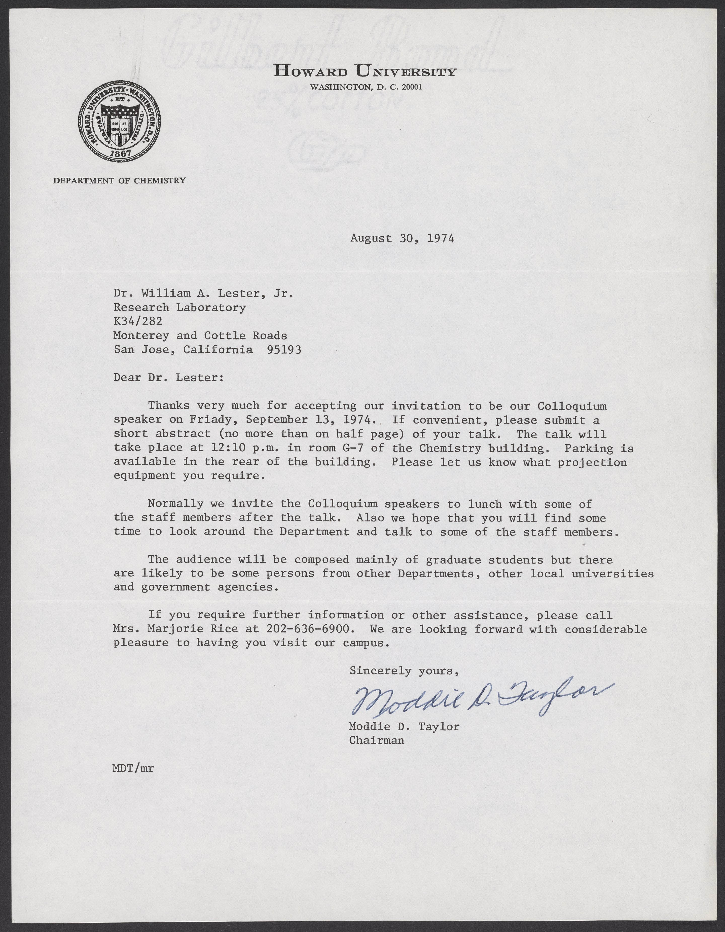 Moddie D. Taylor (1912-1976) writes to William A. Lester, Jr. (1937-) about an upcoming talk Lester will be giving at Howard University.