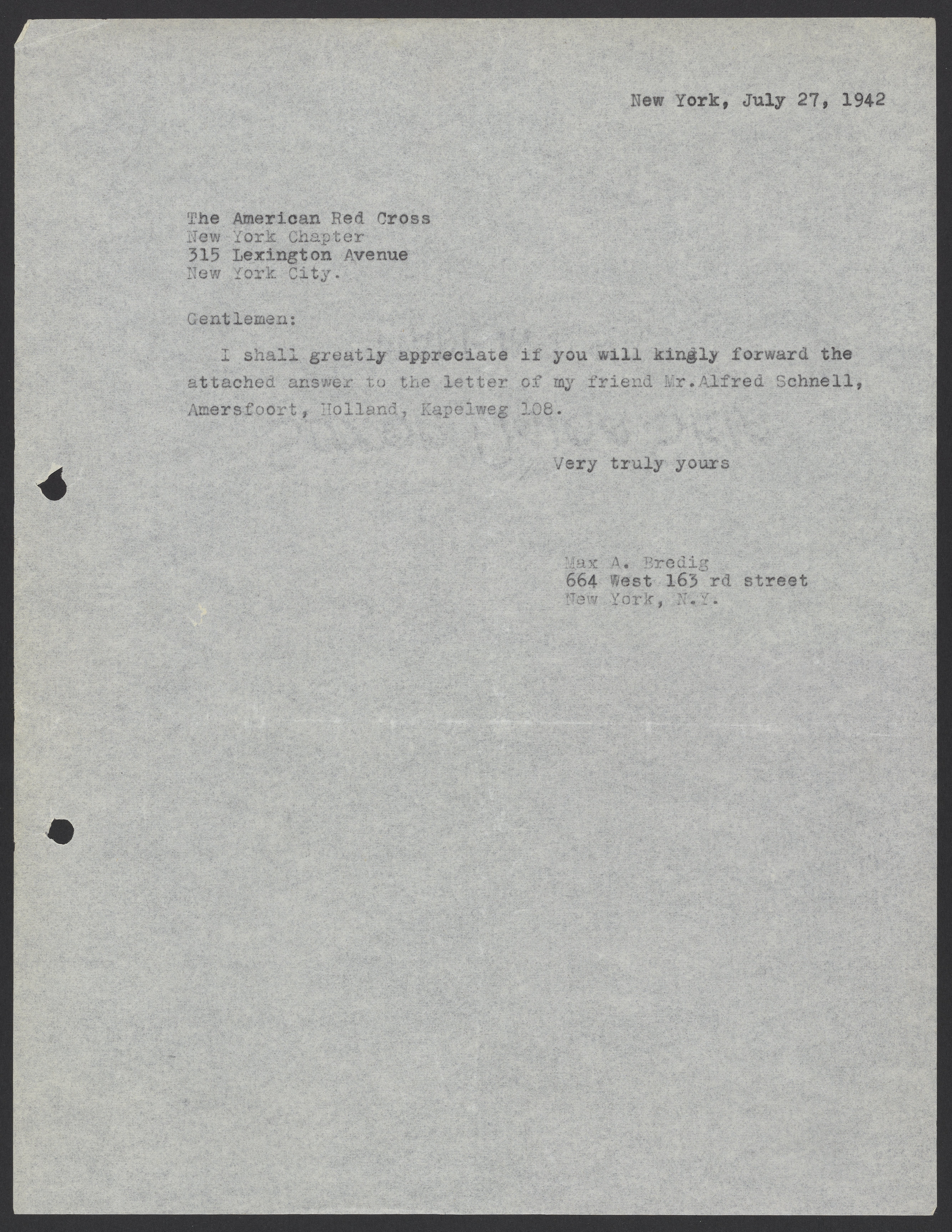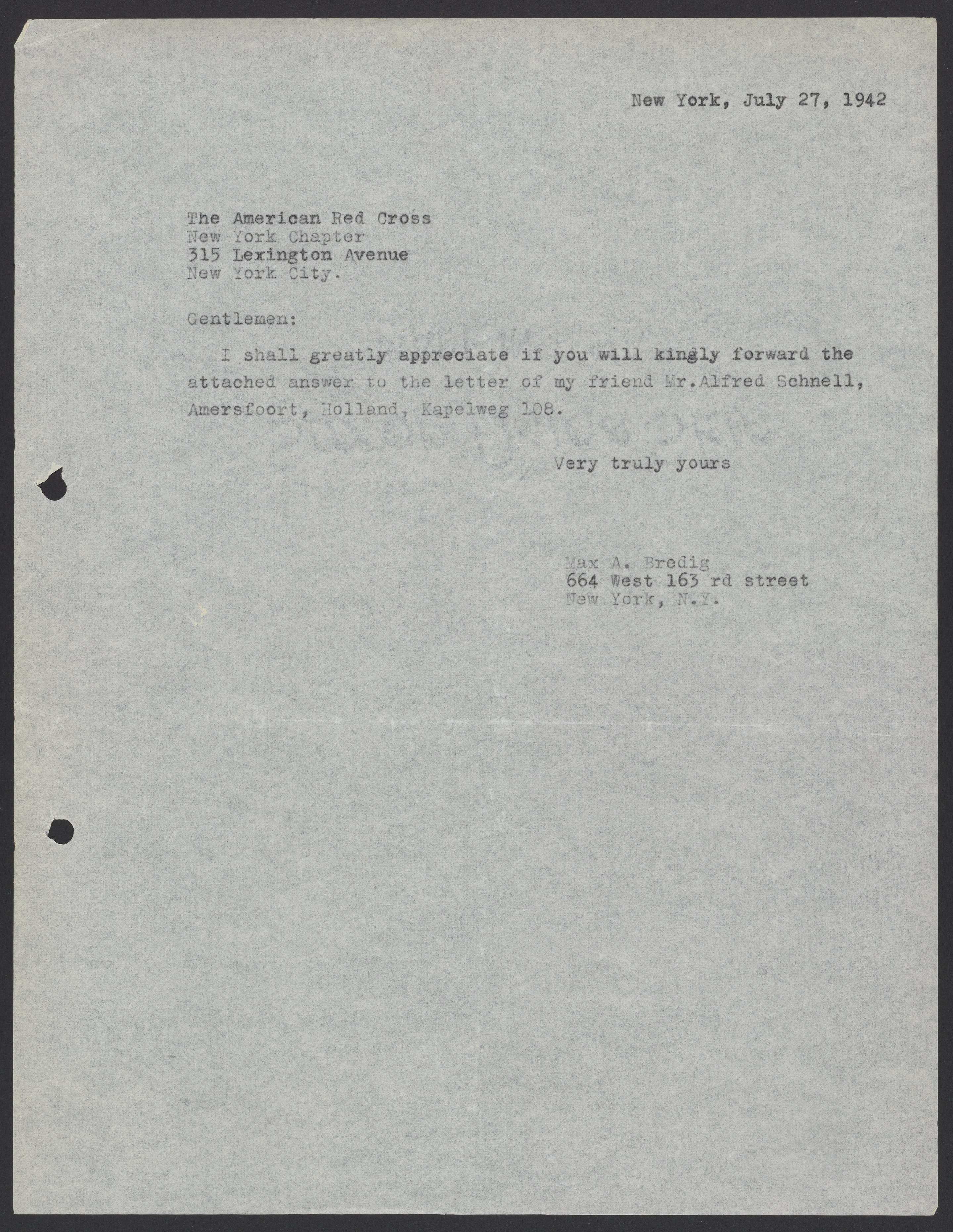 Letter from Max Bredig to the American Red Cross, July 27, 1942
