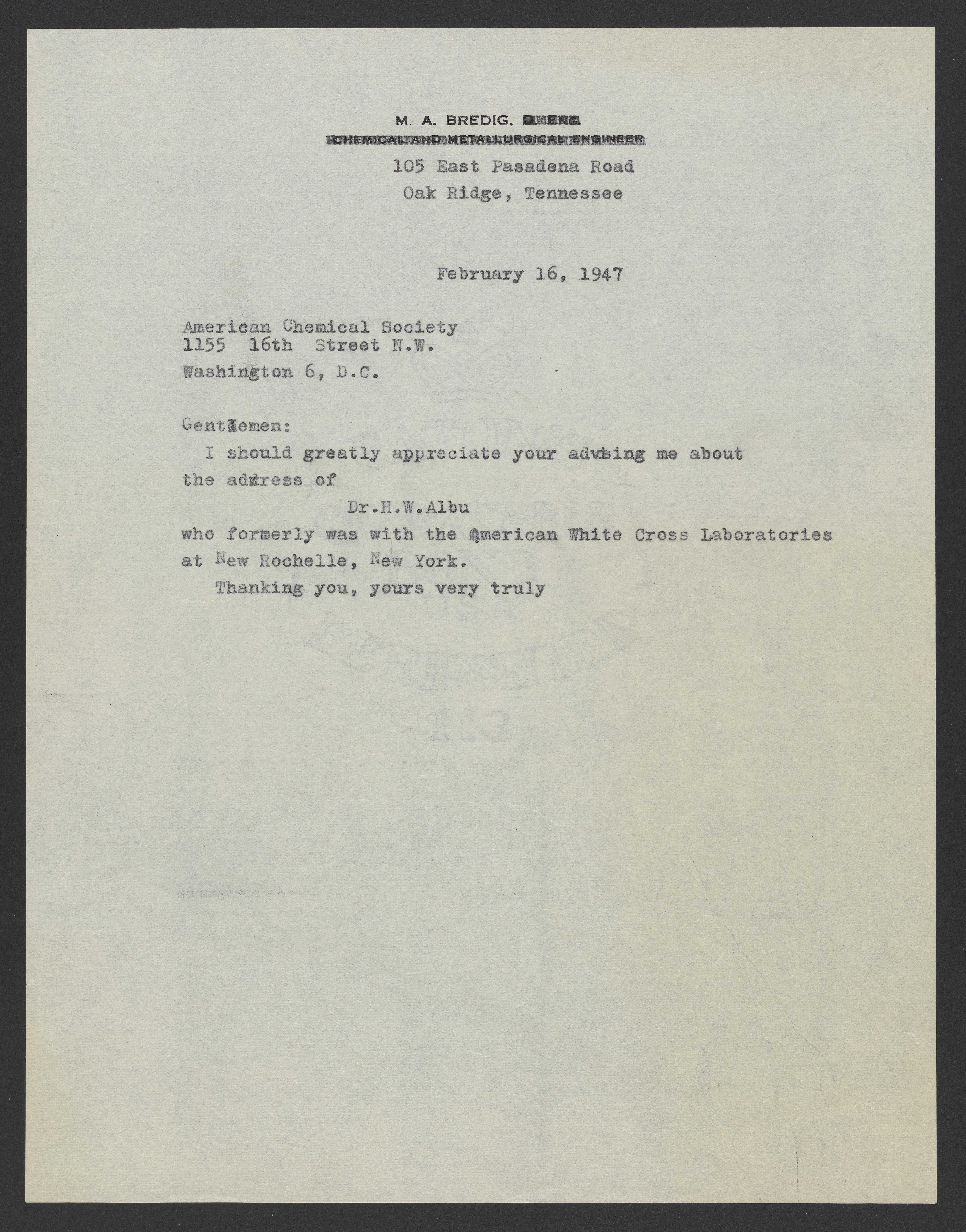 Letter from Max Bredig to the American Chemical Society, February 16, 1947
