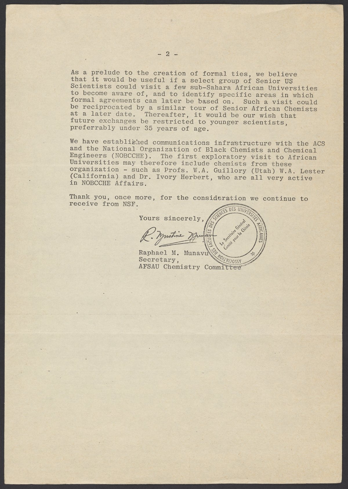 Small JPG1200 x 1684px — 378 KBLarge JPG2880 x 4041px — 2.2 MBFull-sized JPG5227 x 7335px — 6.9 MBOriginal fileTIFF — 5227 x 7335px — 110 MBLetter from Raphael M. Munavu, the secretary for the Association of Faculties of Science of African Universities (AFSAU) Chemistry Committee, and a member of the department of chemistry at the University of Nairobi, to Edward A. Knapp, director of the National Science Foundation NSF). Munavu thanks Knapp for the NSF funding that enabled four American chemists to participate in the 2nd International Chemistry Conference in Nairobi. He expresses interest in other opportunities for collaboration between African and American chemists, particularly the NSF's Science in Developing Countries (SDC) program.